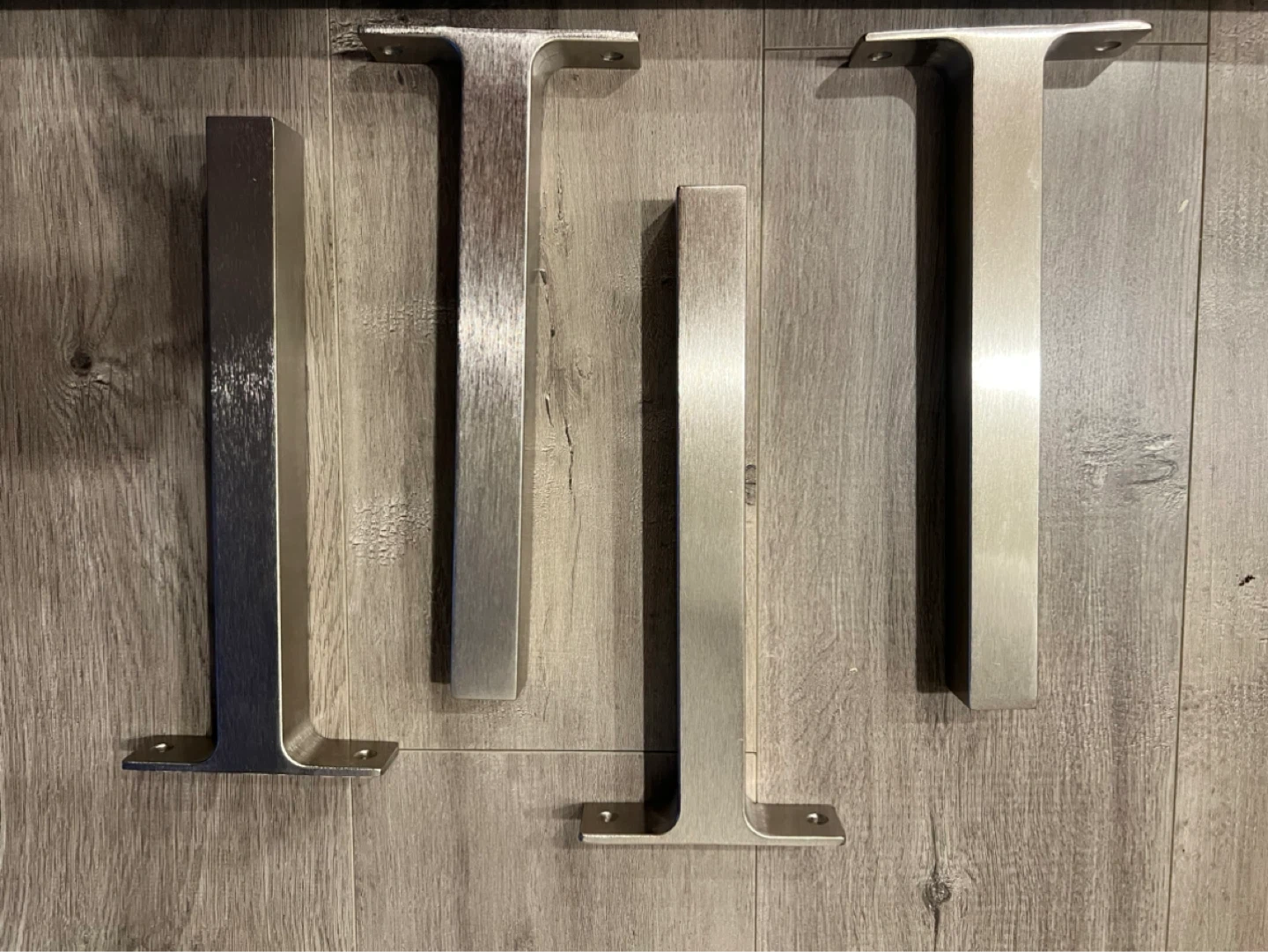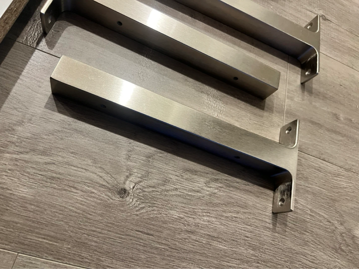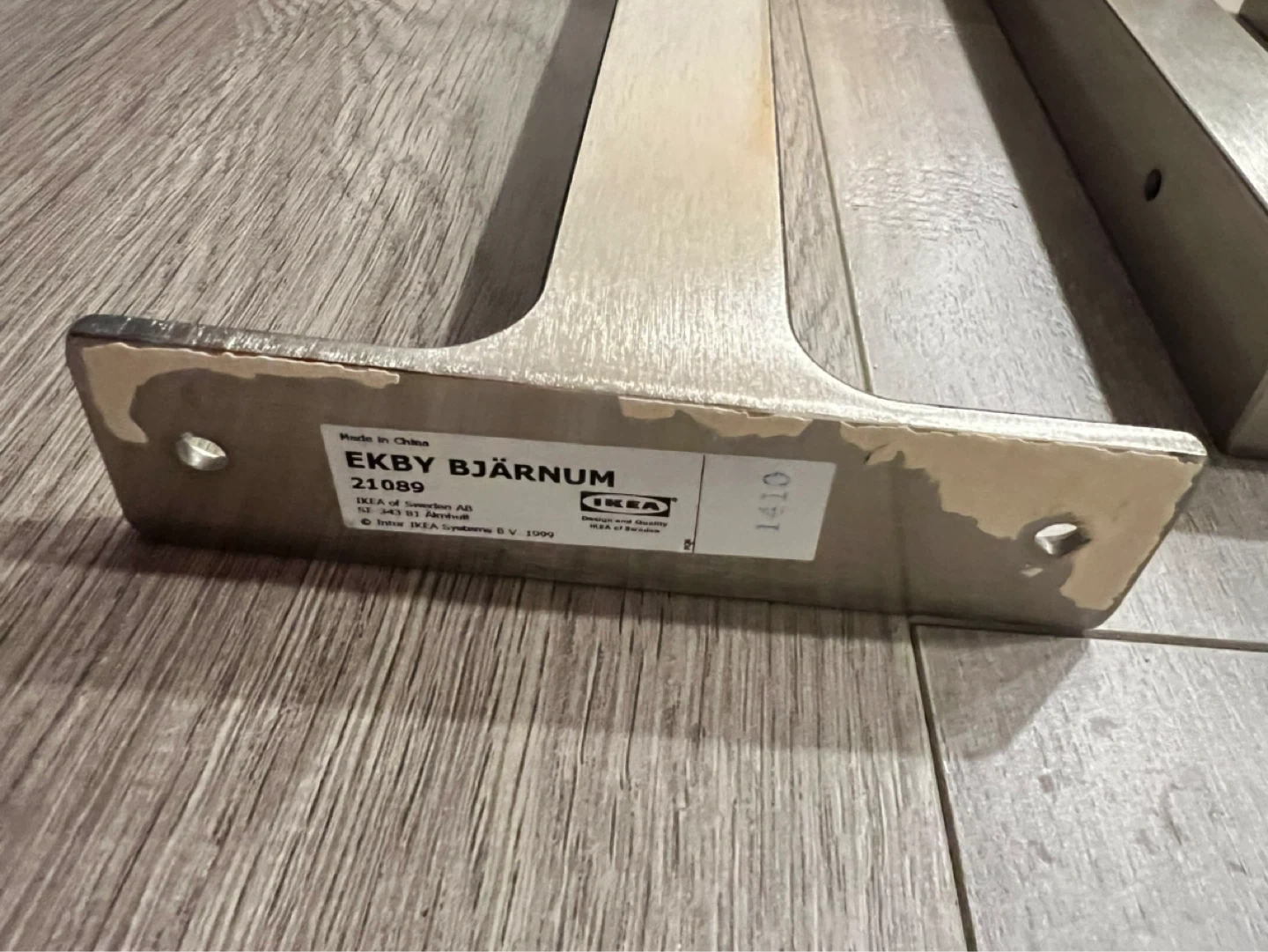 This is a white large IKea shelf with silver- brushed tone metal brackets. It's approximately 47 inches long/ 11 inch wide. Great for organizing your space!