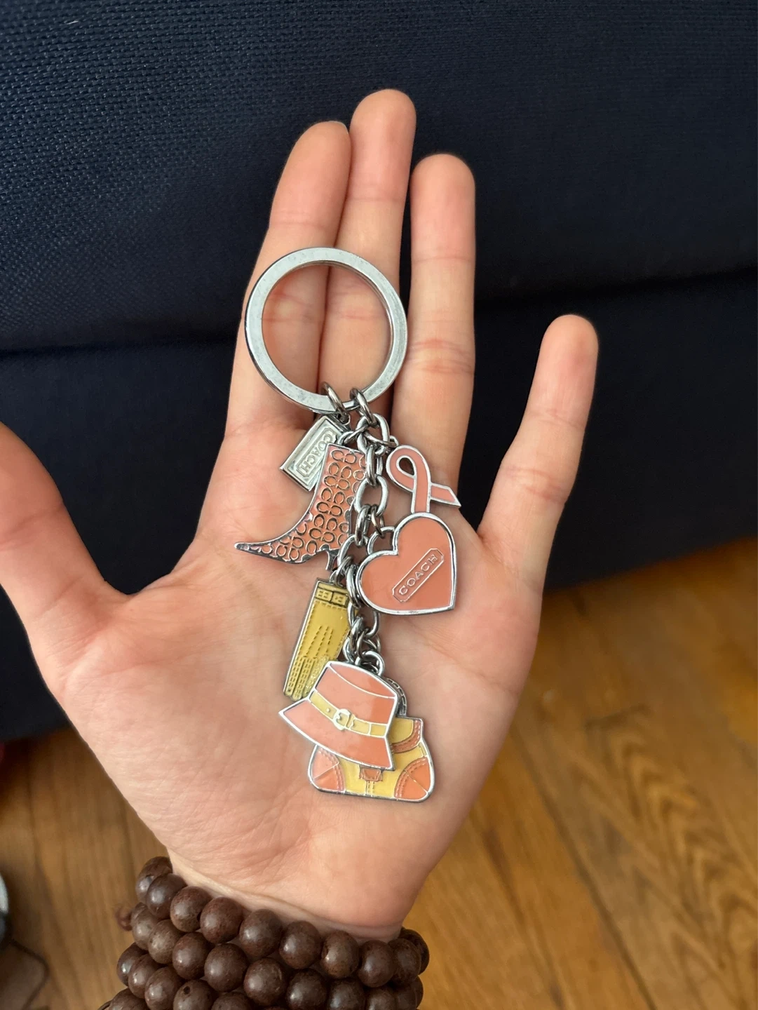 This is a Coach keychain featuring multiple playful charms. It includes a boot, a heart, a hat, a handbag, and a ribbon. It's a fun accessory to personalize your keys or bag!
