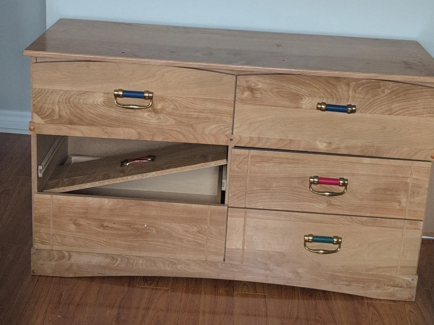 This oak dresser has six drawers, with different coloured handles on each. One drawer has a broken shelf inside. It's made of wood.