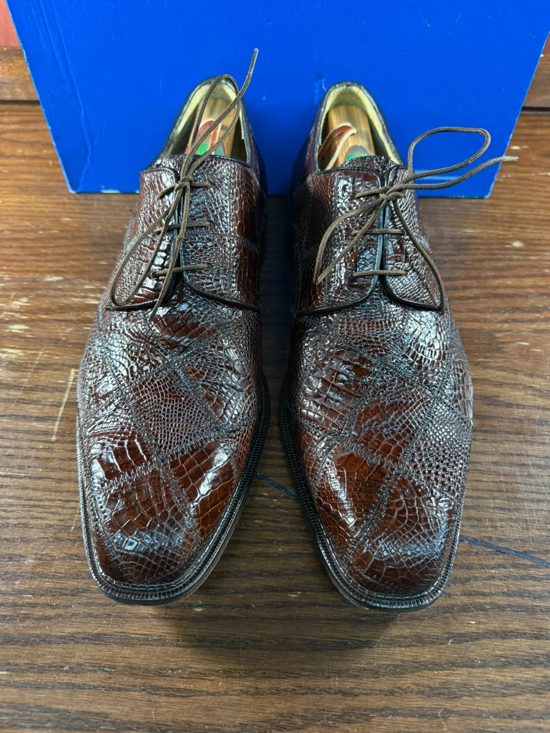 Handmade Belvedere Studio dress shoes crafted from genuine alligator leather.