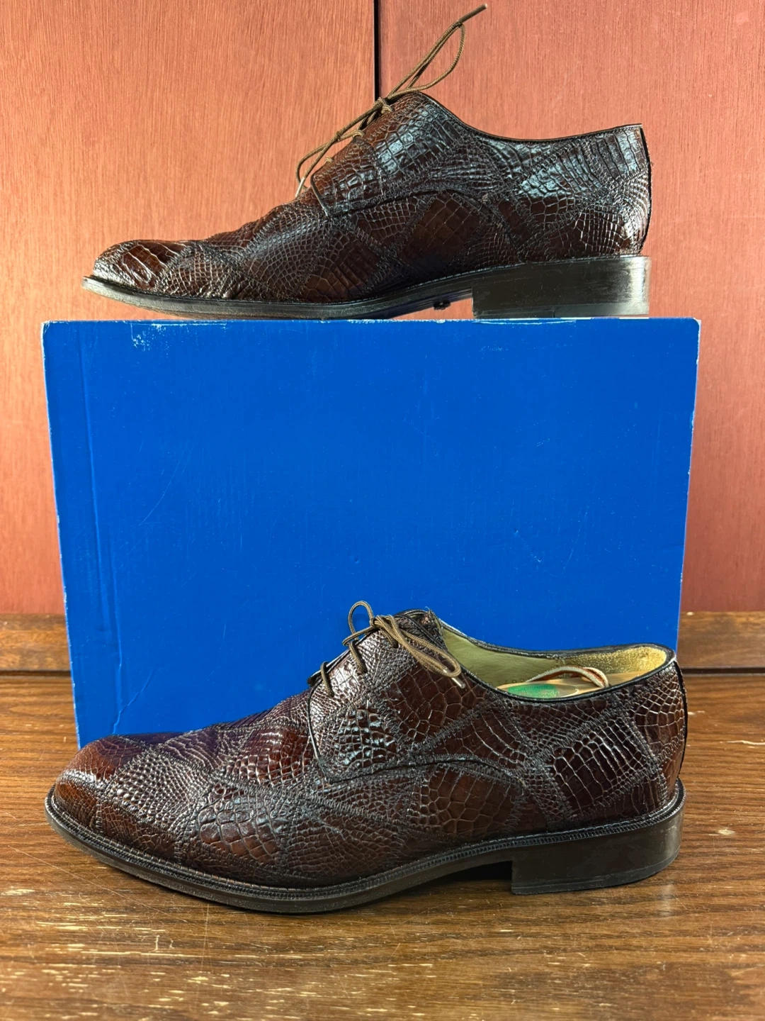 Step out in style with these gently used Belvedere Studio genuine Alligator š dress shoes, a luxurious addition to any gentleman's wardrobe in US size 10. These shoes feature a unique alligator skin pattern and are made in Mexico.
