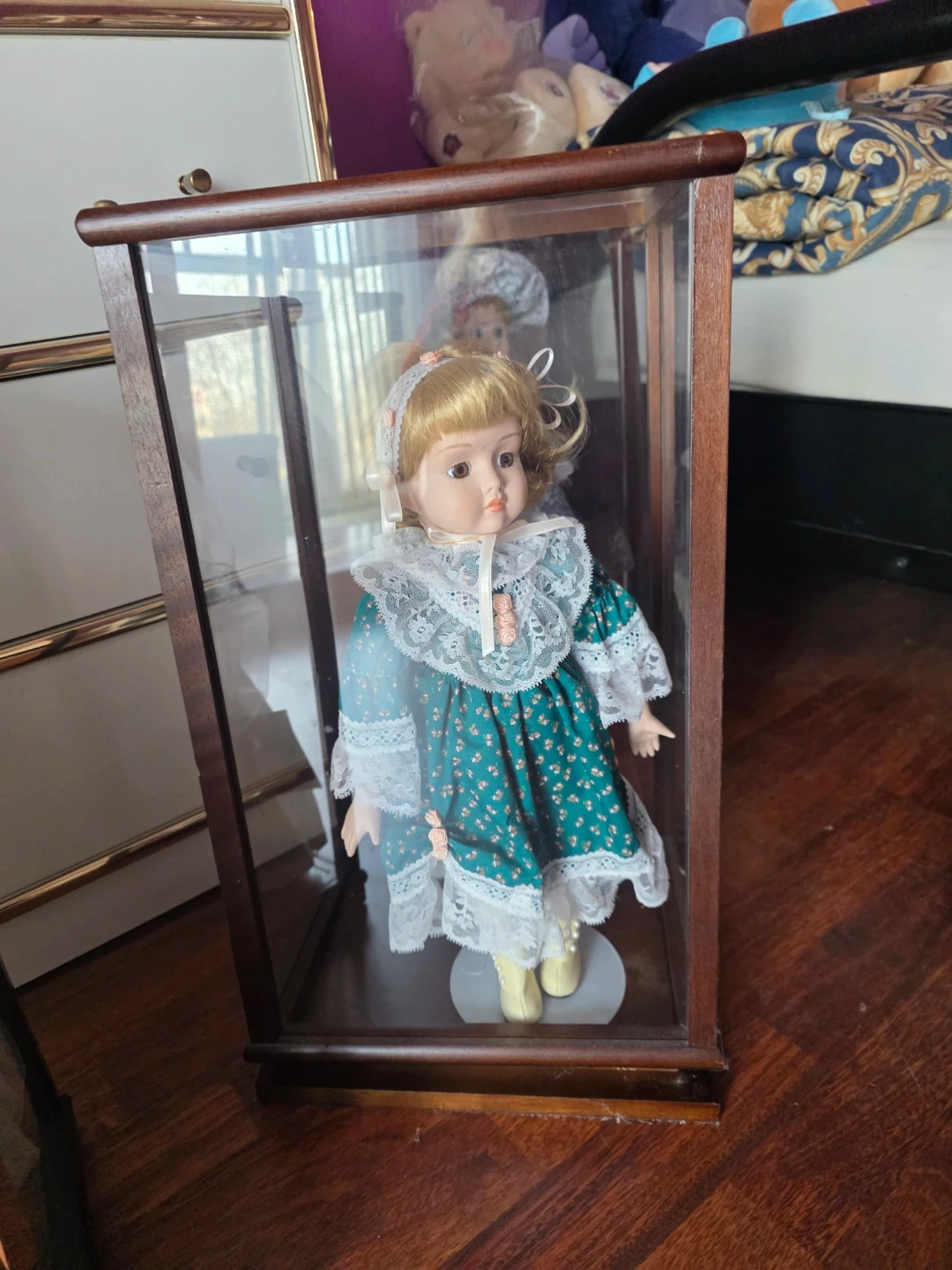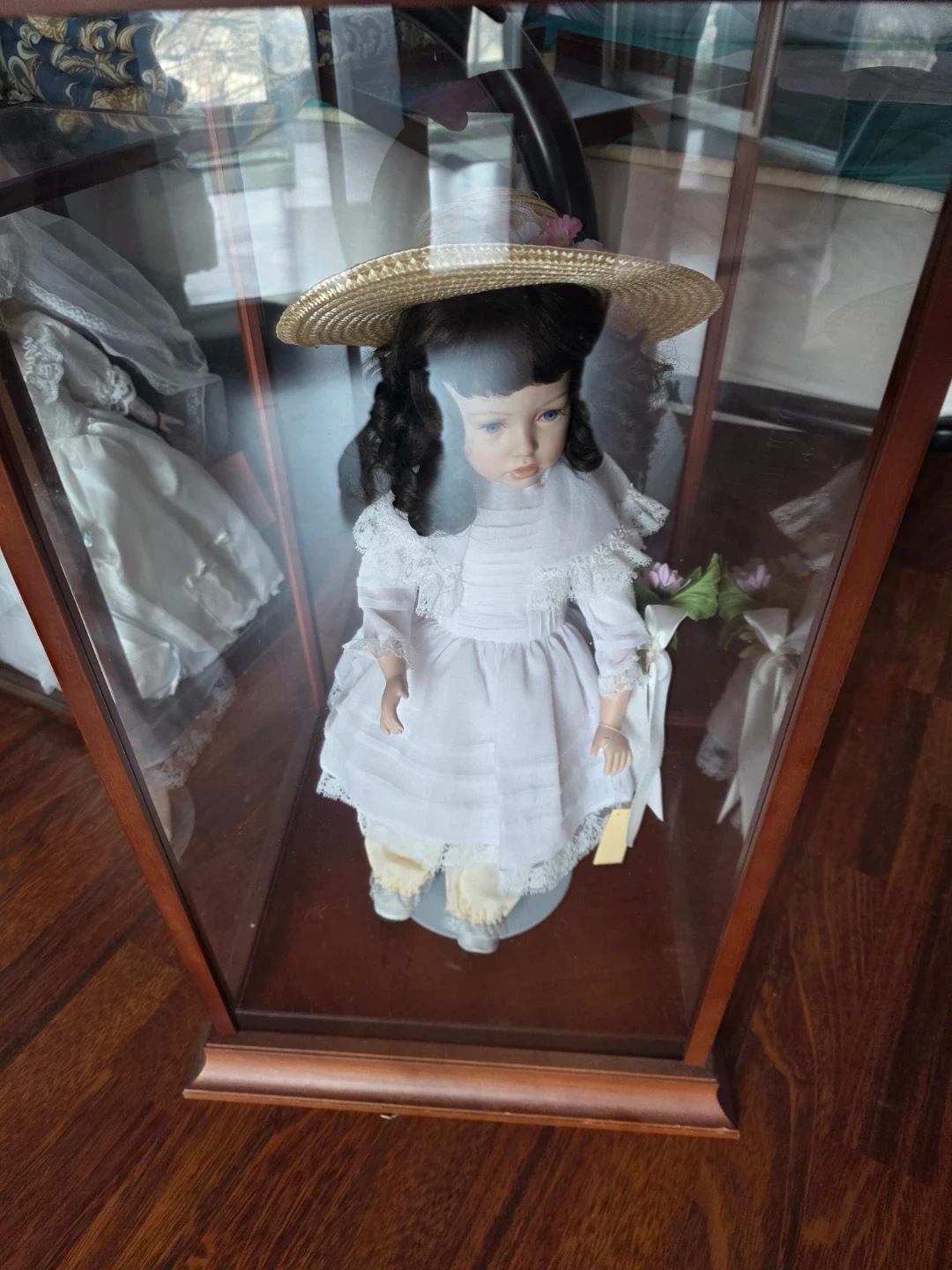 This is a collection of decorative dolls and figurines, perfect for display. Included are several porcelain dolls in vintage-style dresses and various small figurines. They're ideal for collectors or as decorative accents for a shelf.