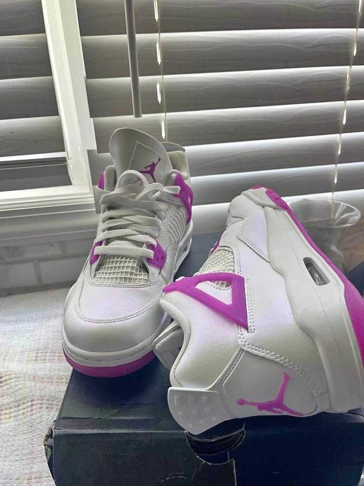 This is a pair of Nike Air Jordan 4 Retro GS sneakers in a white and pink colorway, featuring the classic mesh paneling and signature Jumpman logo. The shoes appear to be in very good condition with minimal visible wear, and come with the original box, though the box shows some damage. These are a popular youth model, often sought after for their distinctive color and iconic design.