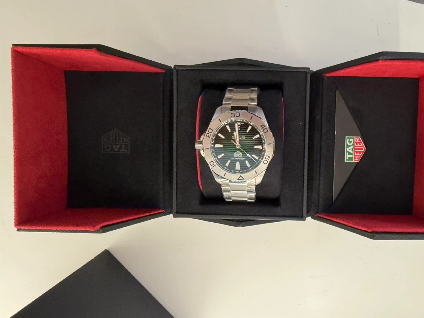 The watch has never been worn and still has the original tag and protective plastic on the bracelet. It comes with the original TAG Heuer box, exactly as shown in the photos.