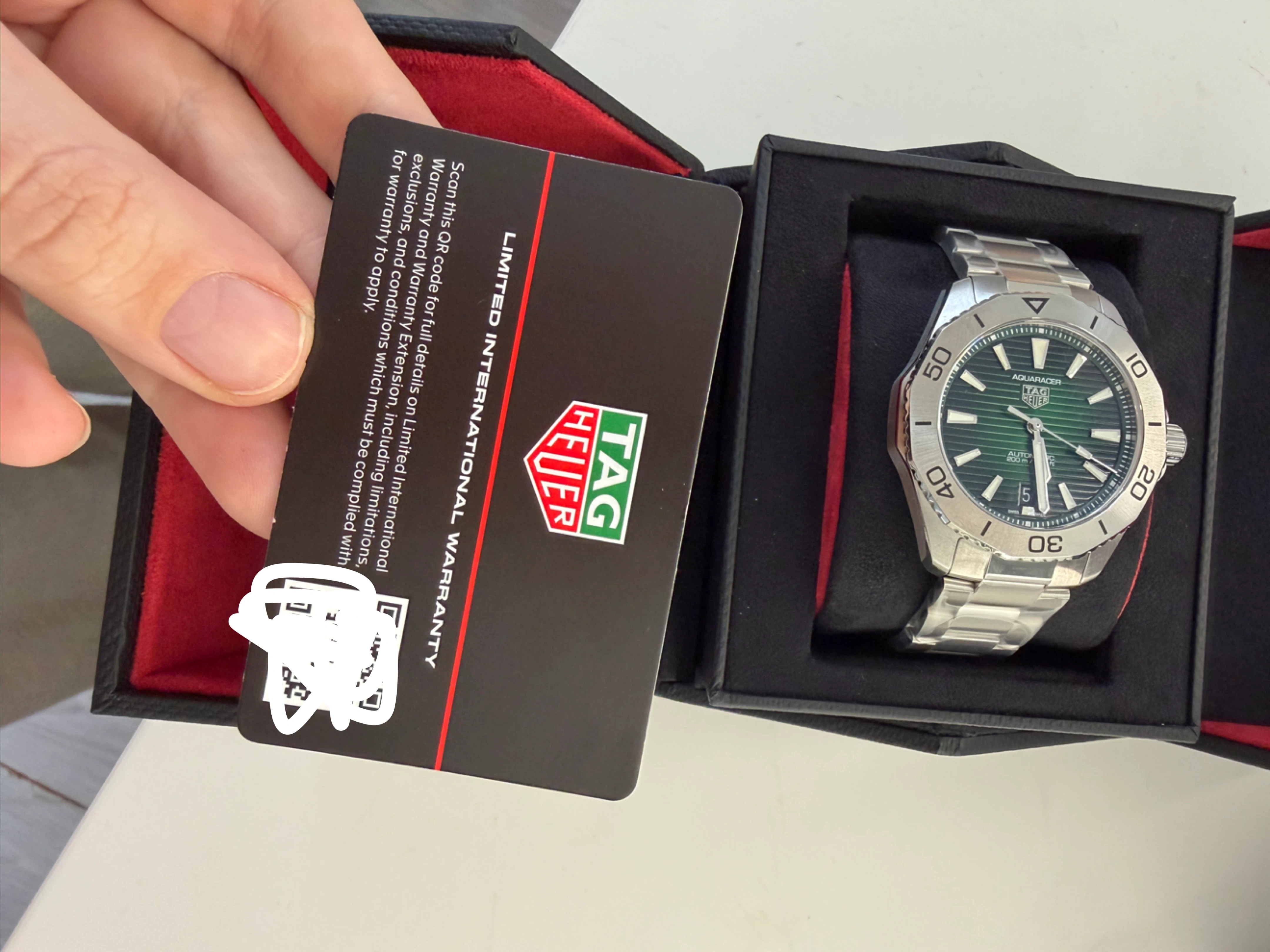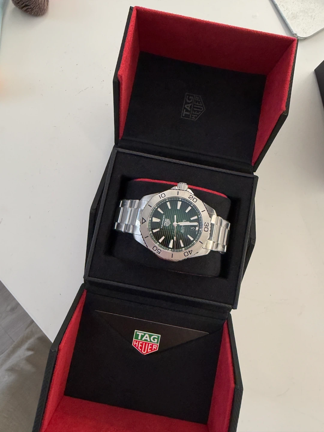 The watch has never been worn and still has the original tag and protective plastic on the bracelet. It comes with the original TAG Heuer box, exactly as shown in the photos.