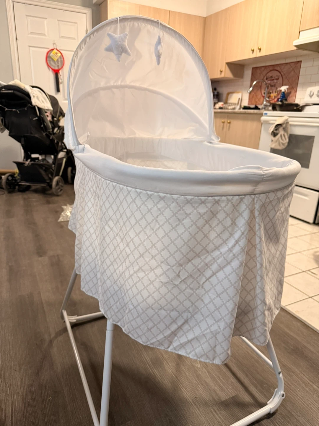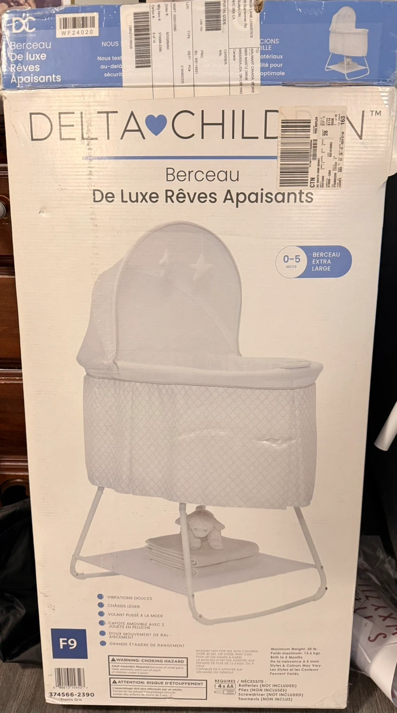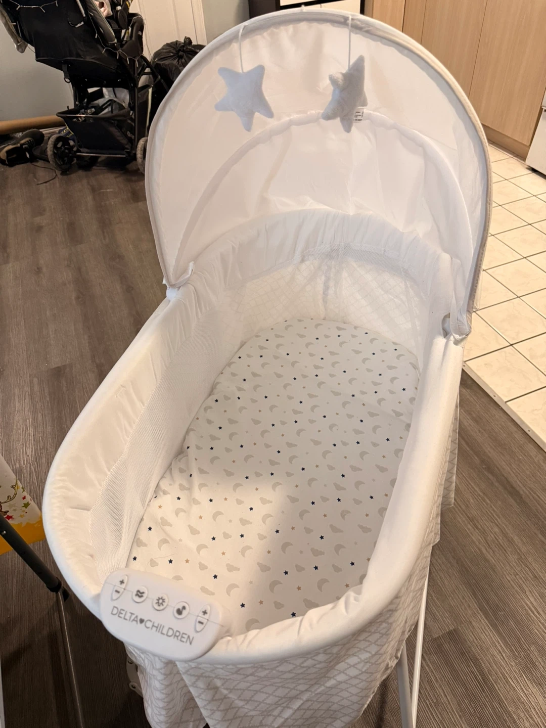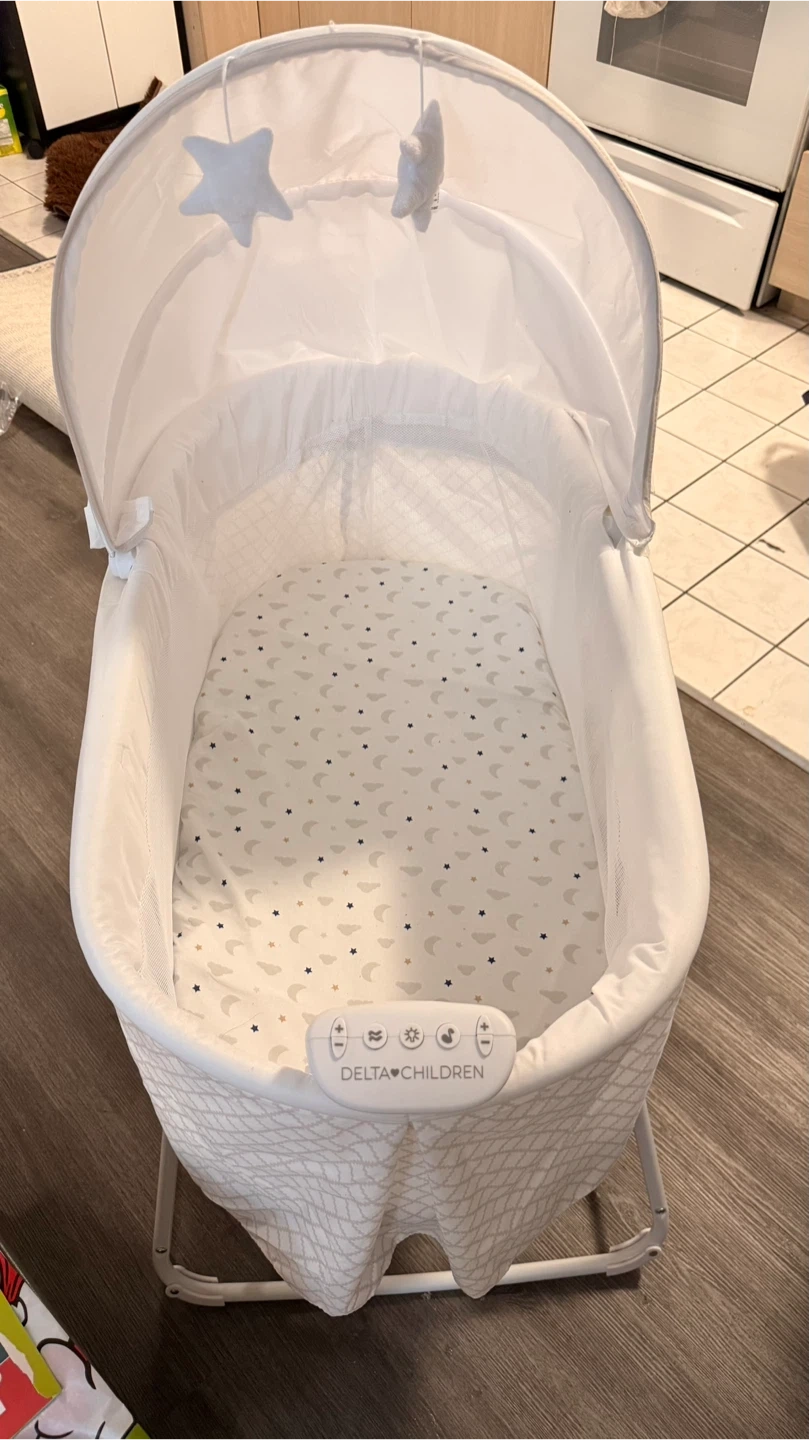 This Delta Children bassinet features gentle vibrations and a soothing canopy. It's extra large and includes a comfortable mattress pad with a moon and star print. It's suitable for babies up to 5 months or when they can push up on their hands and knees.