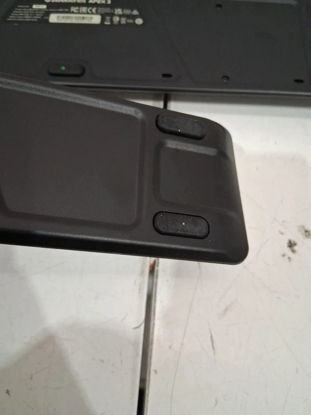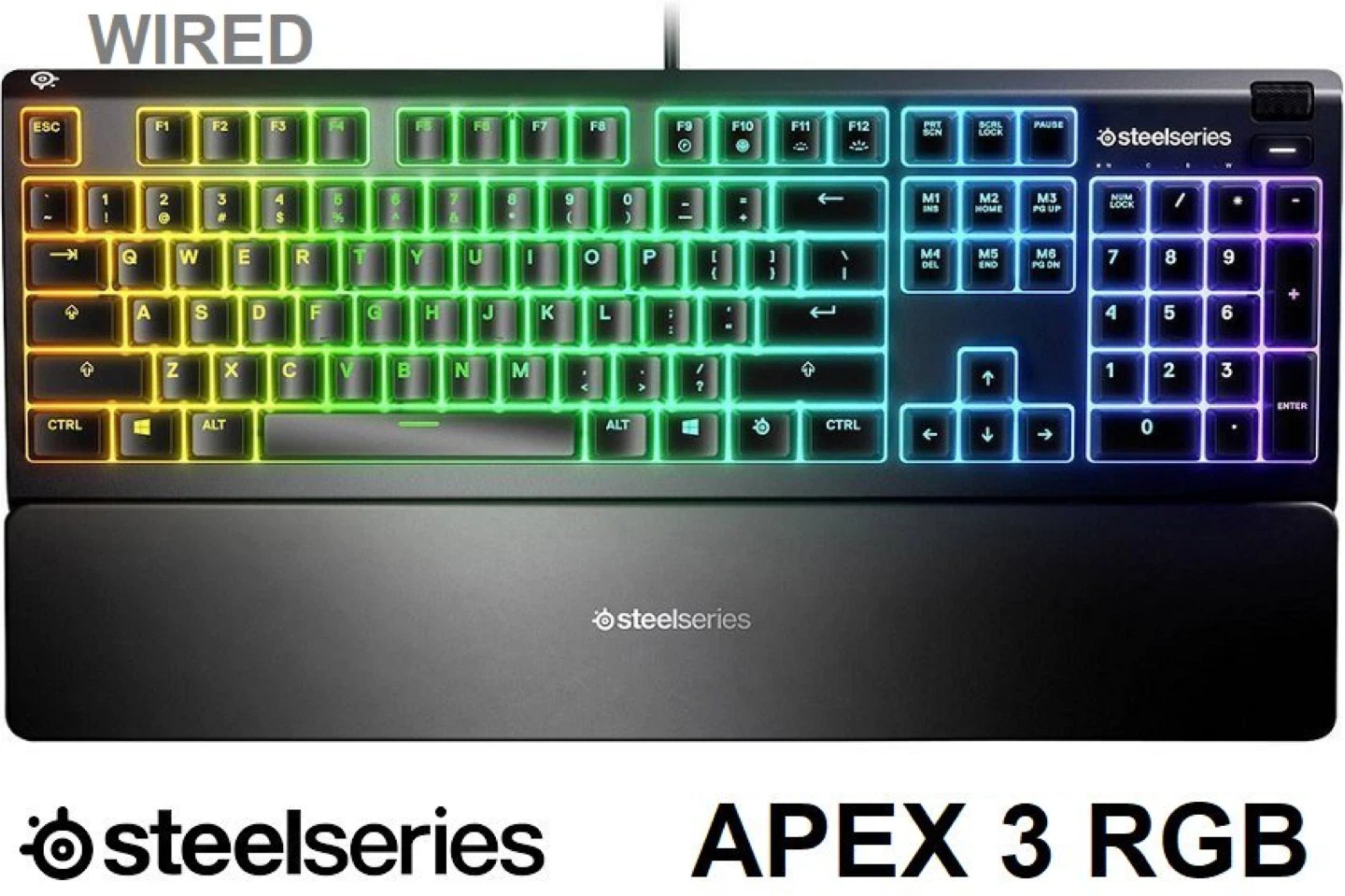 This is a SteelSeries Apex 3 wired RGB gaming keyboard. It features IP32 water resistance and a detachable wrist rest. The keyboard has customizable RGB lighting zones for a personalized look.