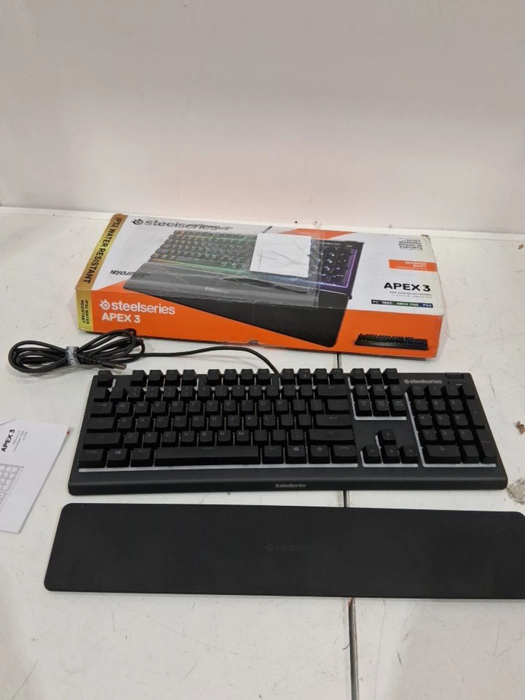 This is a SteelSeries Apex 3 wired RGB gaming keyboard. It features IP32 water resistance and a detachable wrist rest. The keyboard has customizable RGB lighting zones for a personalized look.