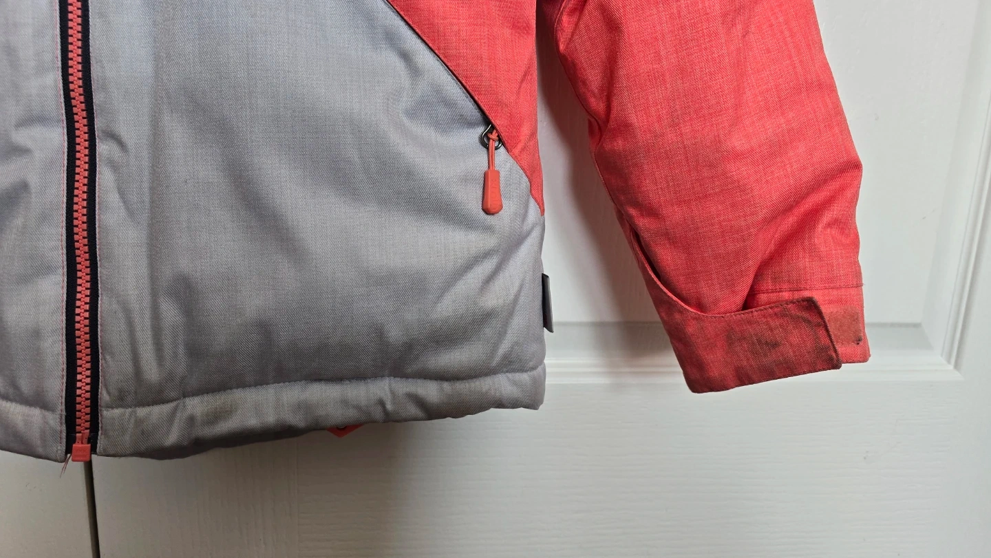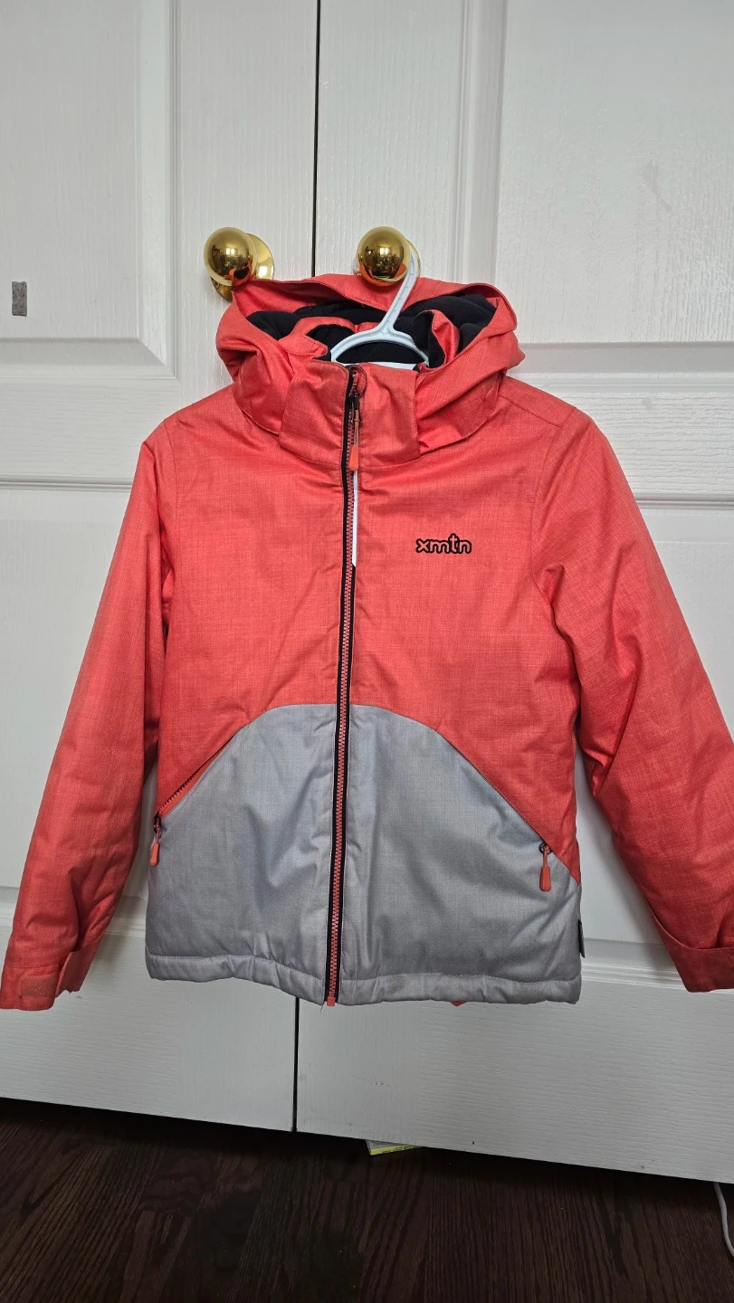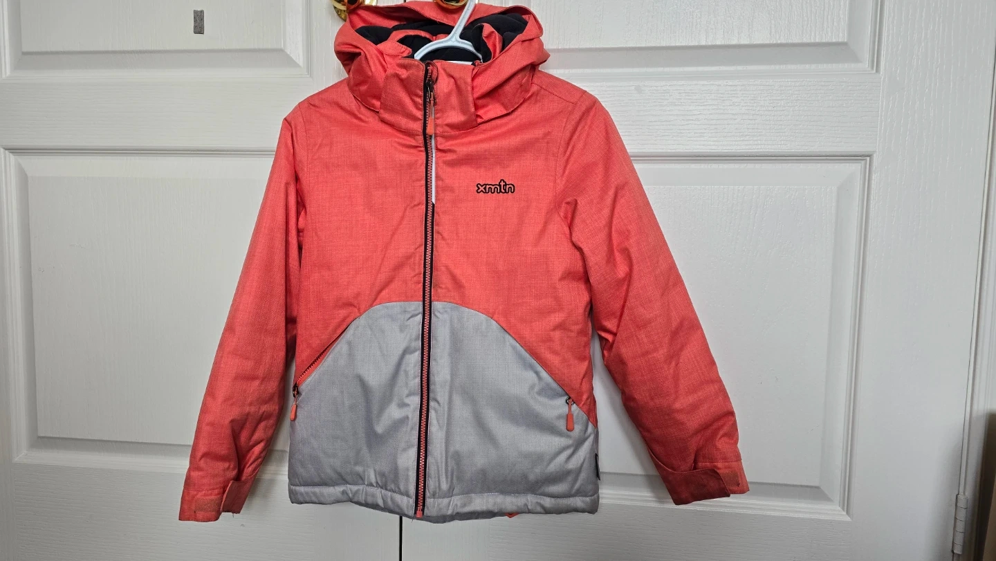This X-Mtn ski snow jacket is designed for kids. It's a colourful coral and grey jacket with a hood. Features include a zip-up front and pockets.