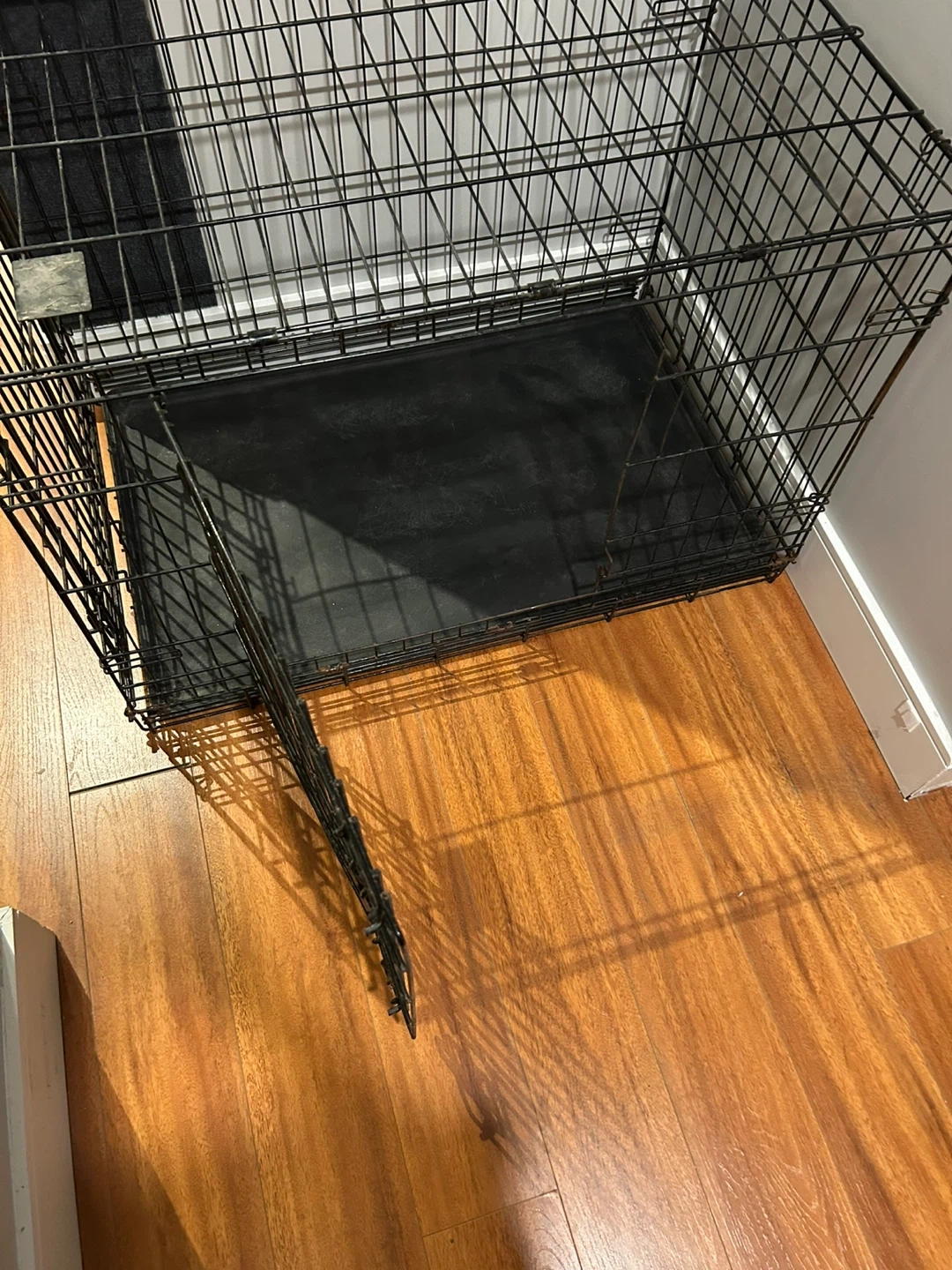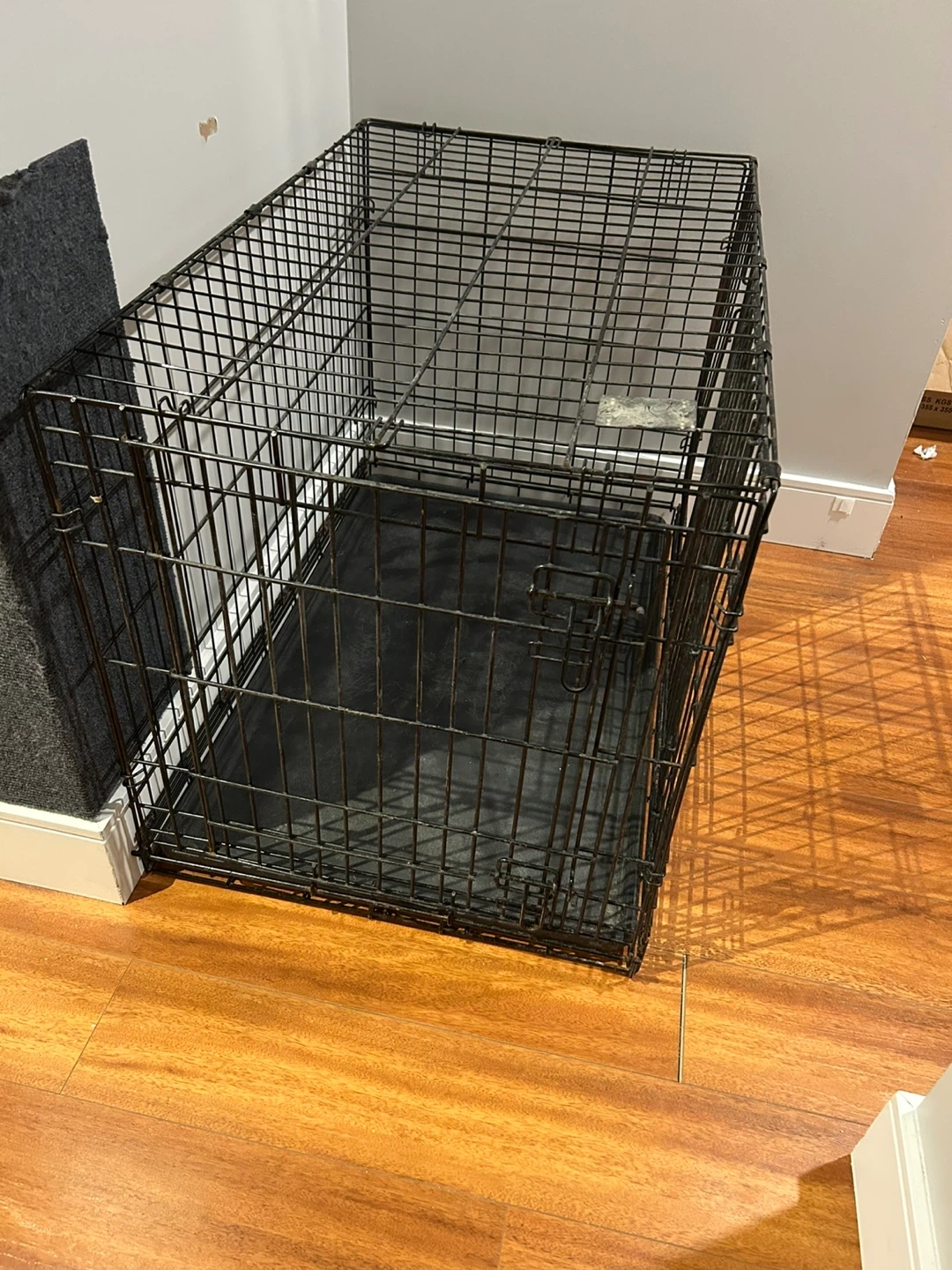 A standard black metal dog crate, includes a removable plastic tray for easy cleaning. It folds flat for storage and transport. Durable wire construction. The crate has 2 entry/exit points. It fits a full grown Siberian husky to give you an idea of the inner size.