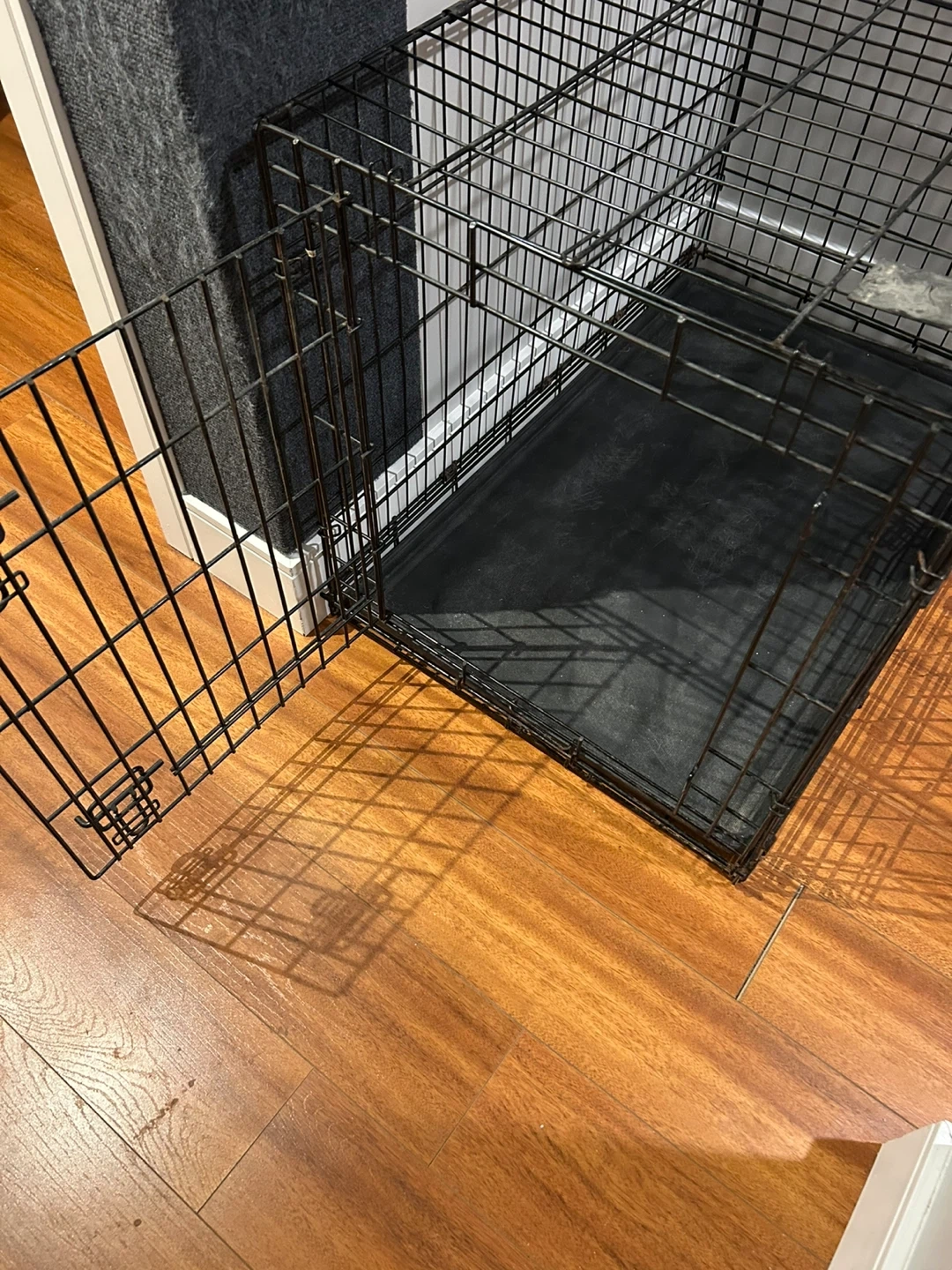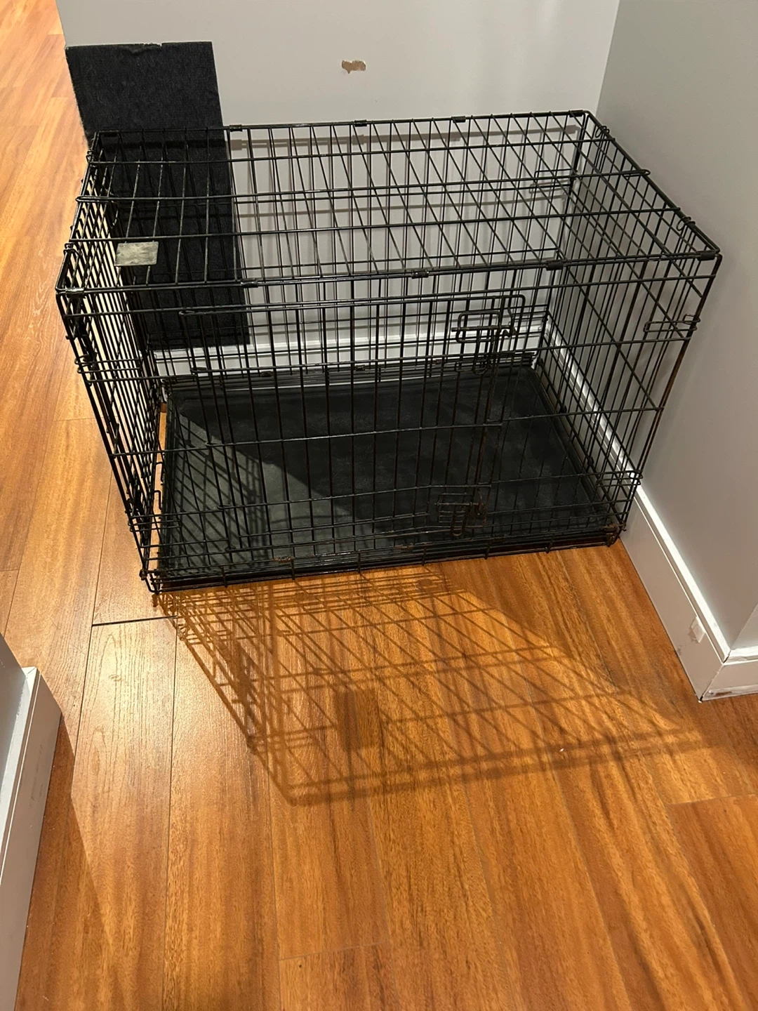 A standard black metal dog crate, includes a removable plastic tray for easy cleaning. It folds flat for storage and transport. Durable wire construction. The crate has 2 entry/exit points. It fits a full grown Siberian husky to give you an idea of the inner size.