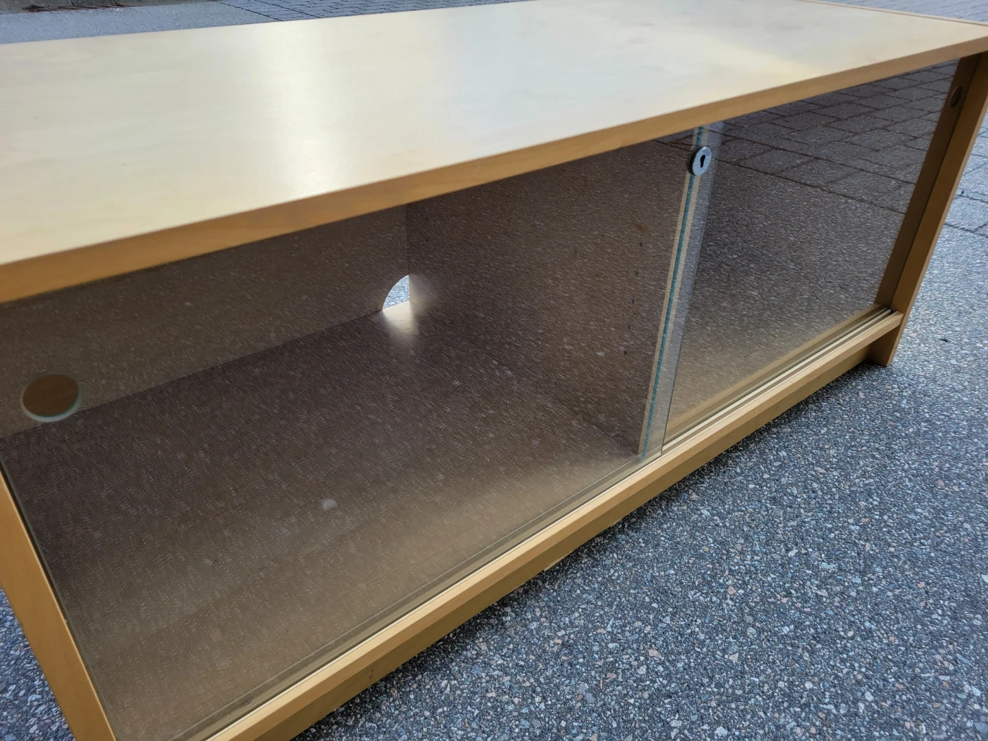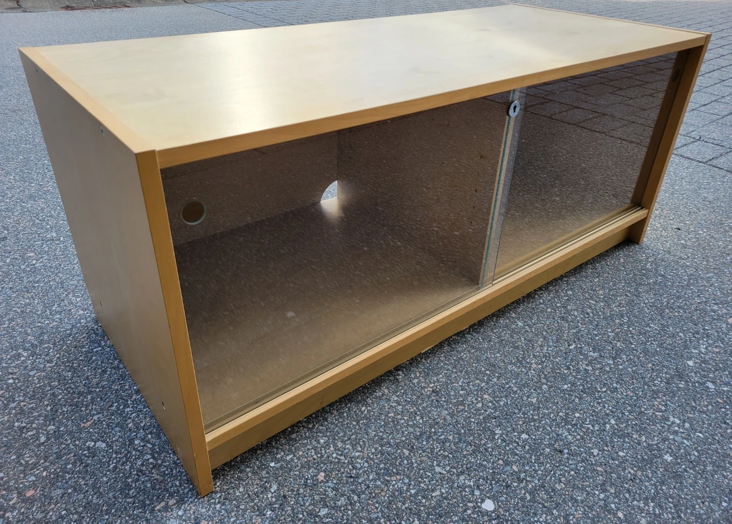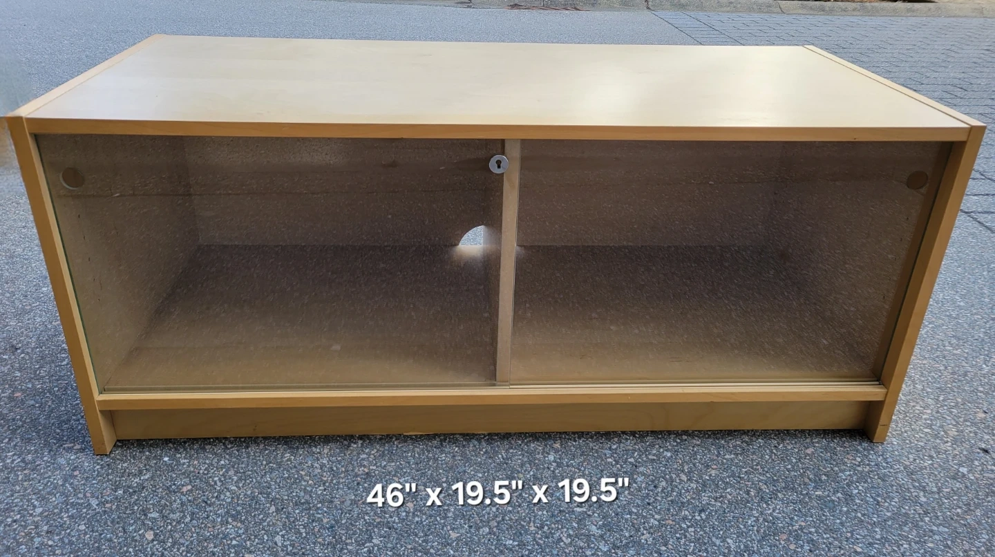 This is a wood and glass cabinet TV stand. It features sliding glass doors and a cable management hole. Dimensions are 46"W x 19.5" D x 19.5"H. Delivery available if needed. Let me know if you are interested. Thanks.