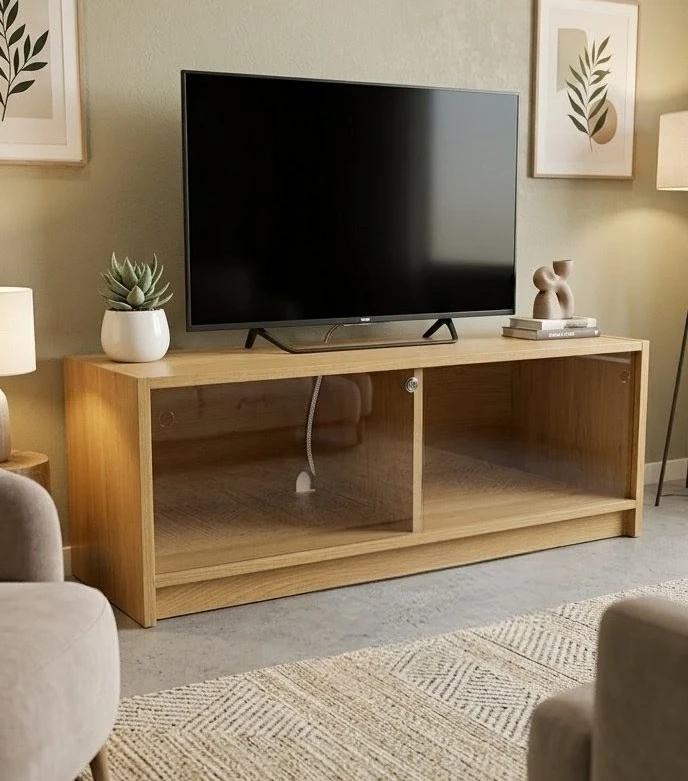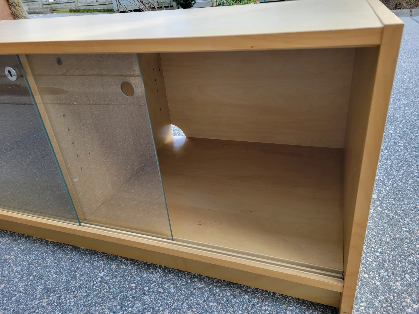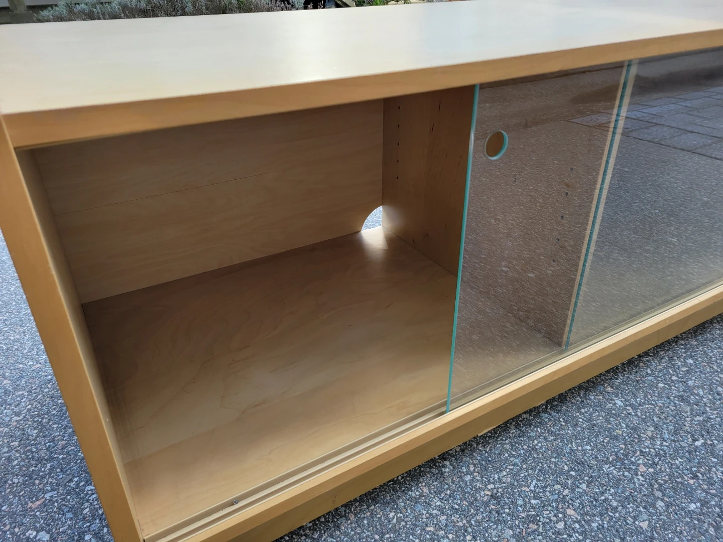 This is a wood and glass cabinet TV stand. It features sliding glass doors and a cable management hole. Dimensions are 46"W x 19.5" D x 19.5"H. Delivery available if needed. Let me know if you are interested. Thanks.