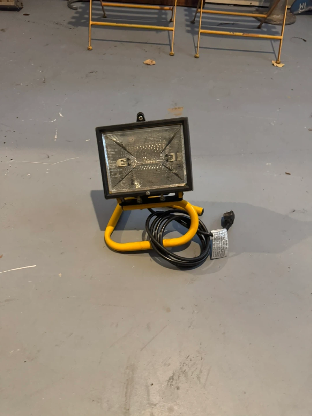 Portable work light with a yellow metal stand and black cord. This light is good for illuminating workshops or construction sites. It's suitable for various tasks where extra lighting is needed.