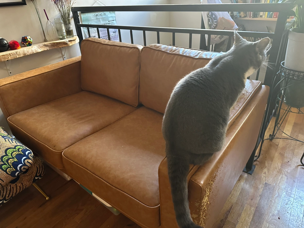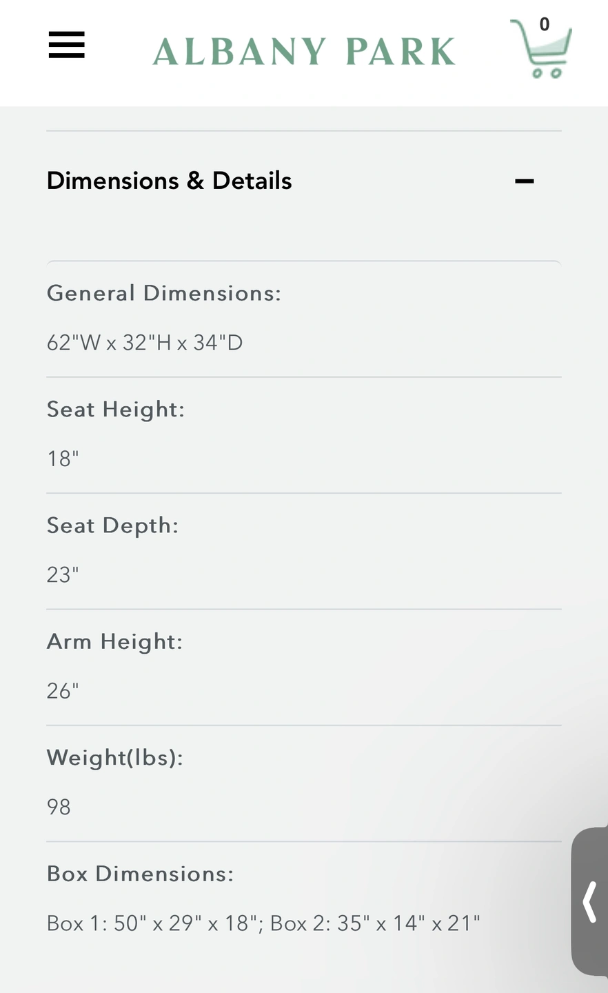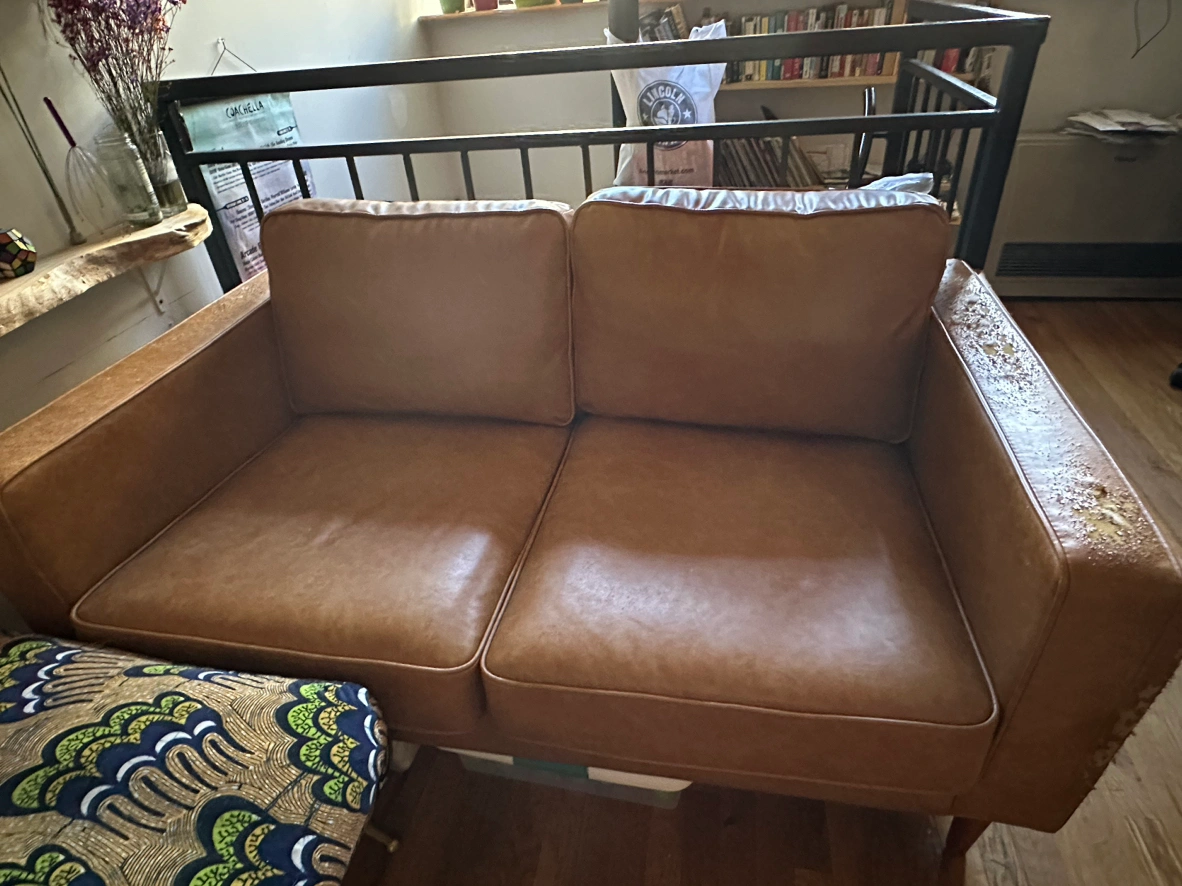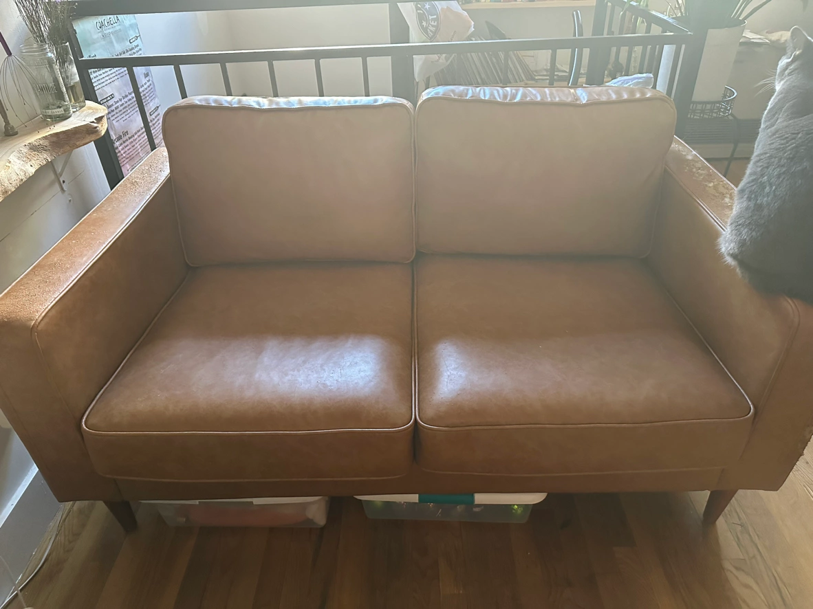 Please read accordingly. The pictures have all the details of this loveseat. It is very deeply reduced. Unfortunately, my cat had a bit of a good time with this loveseat. There is a way to order two new arms and it will look brand new. If you would like me to order the arms, I can. You would need to pay for the arms and along with my asking for this Couch. The arms are no more than $90 per side. Otherwise, this is a perfectly fitting loveseat. I’m only parting with it because I’m merging furniture with my partner.