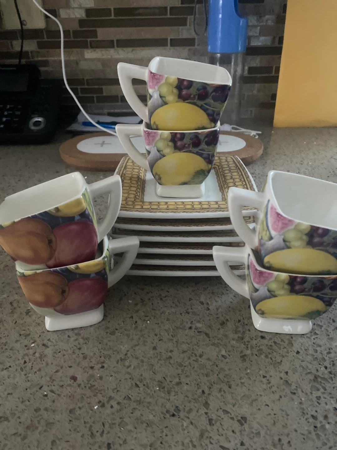 Set of 6 Ceramic Fruit Pattern Teacups and Saucers