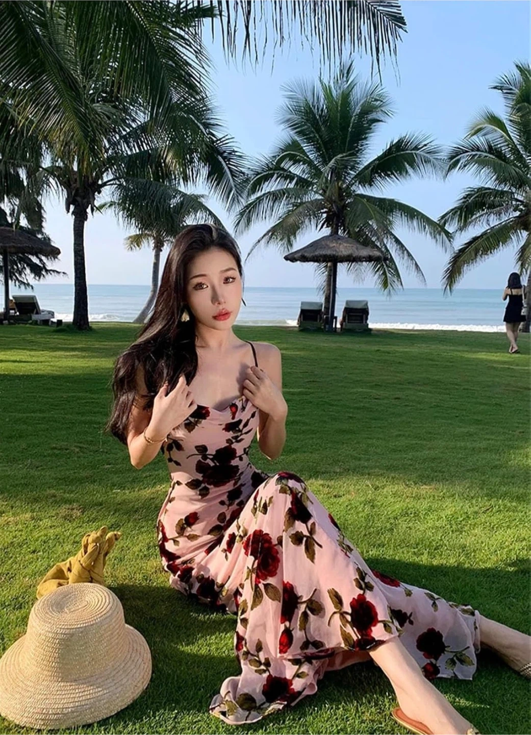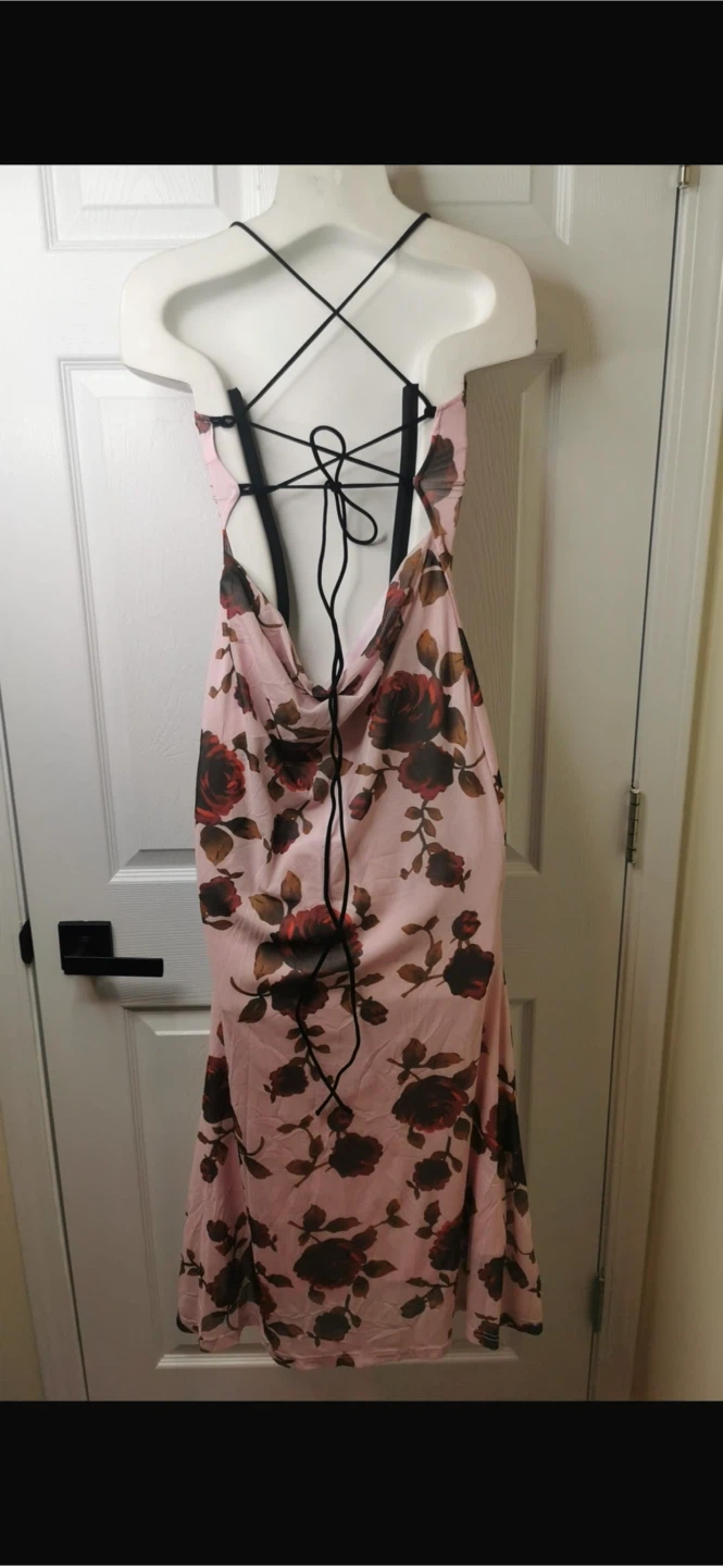 New with tag! Beautiful pink maxi dress featuring a striking red rose print. It's designed with a flattering cowl neckline and delicate spaghetti straps. This elegant dress is perfect for summer occasions or a vacation.