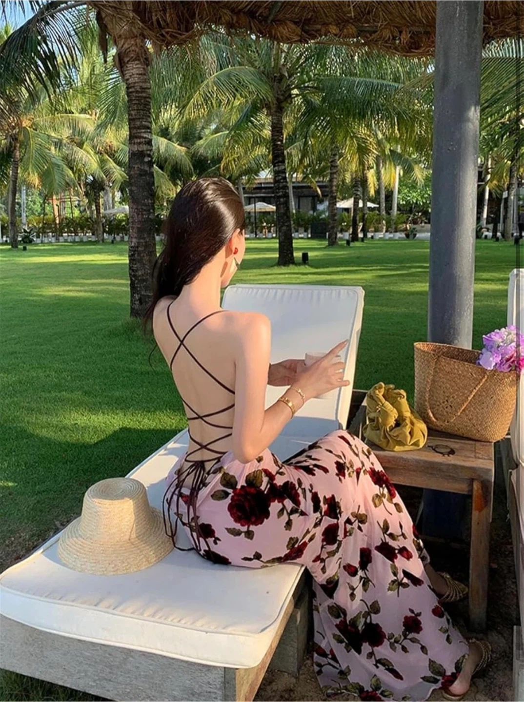 NEW! Pink Floral Backless Maxi Dress with Rose Print