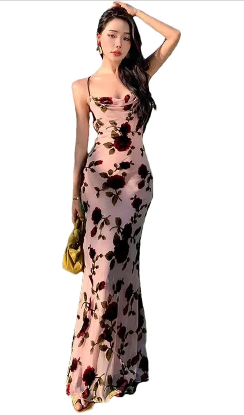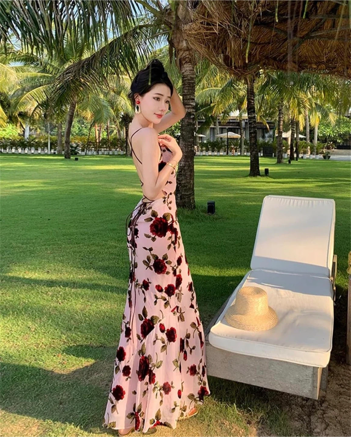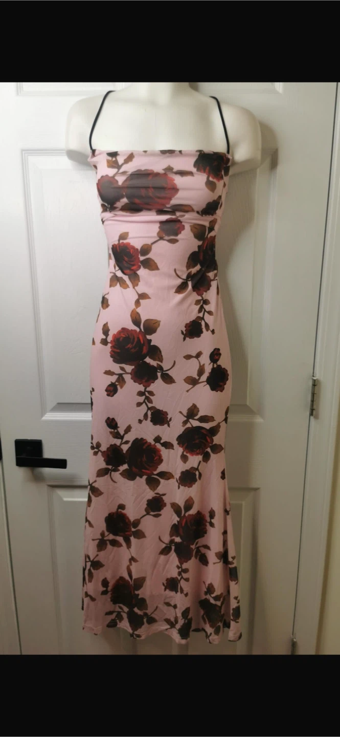 NEW! Pink Floral Backless Maxi Dress with Rose Print