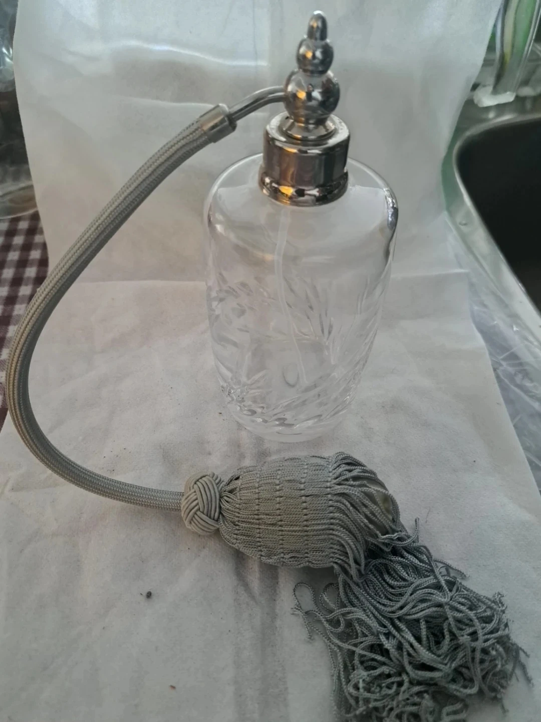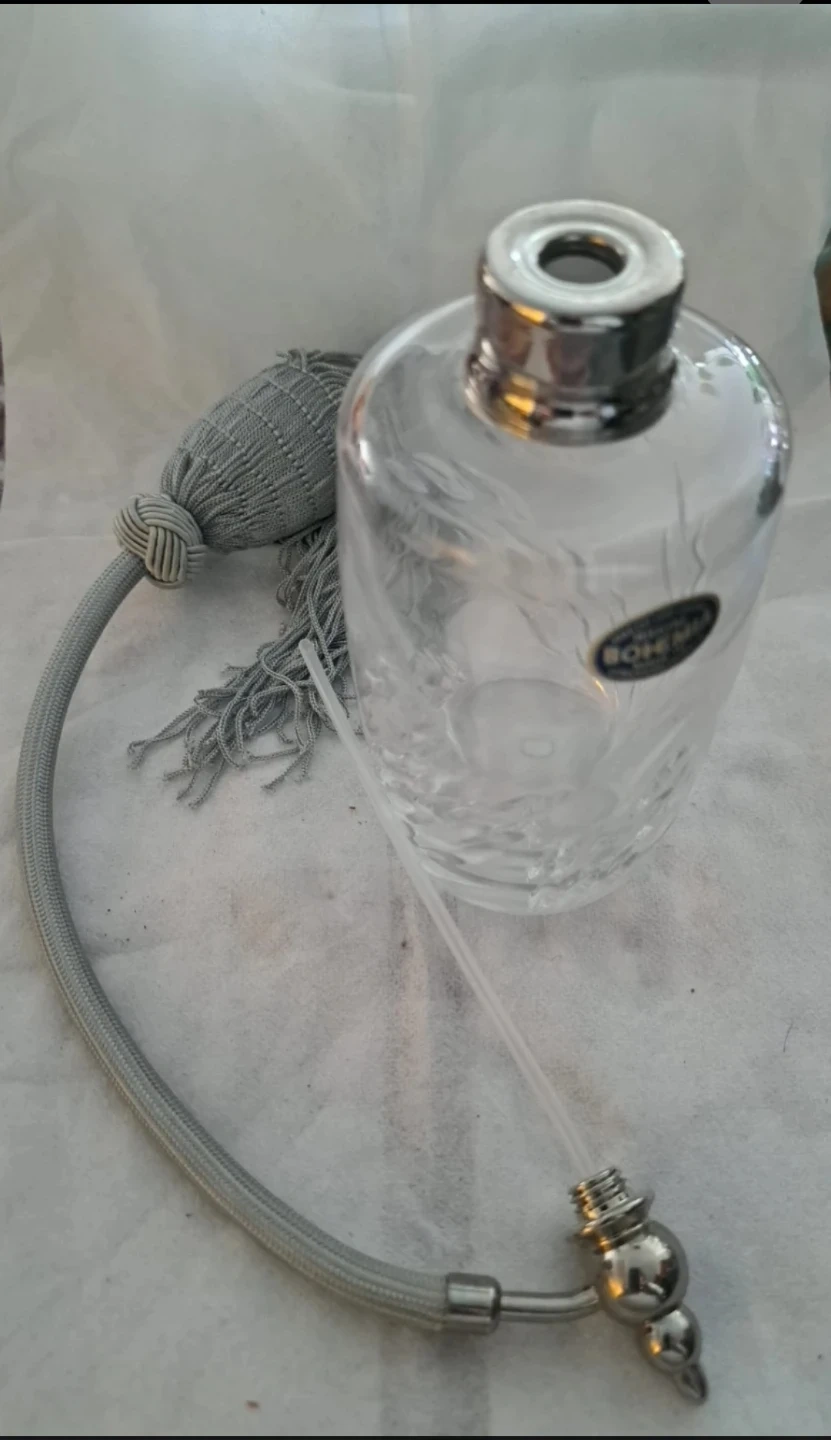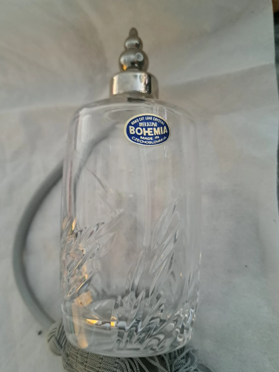 This is a beautiful hand-cut lead crystal perfume atomizer. It's made in Czechoslovakia by Bohemia. The glass has an etched floral design and a silver-tone metal pump with a decorative tassel. It's a lovely vintage piece for your vanity!