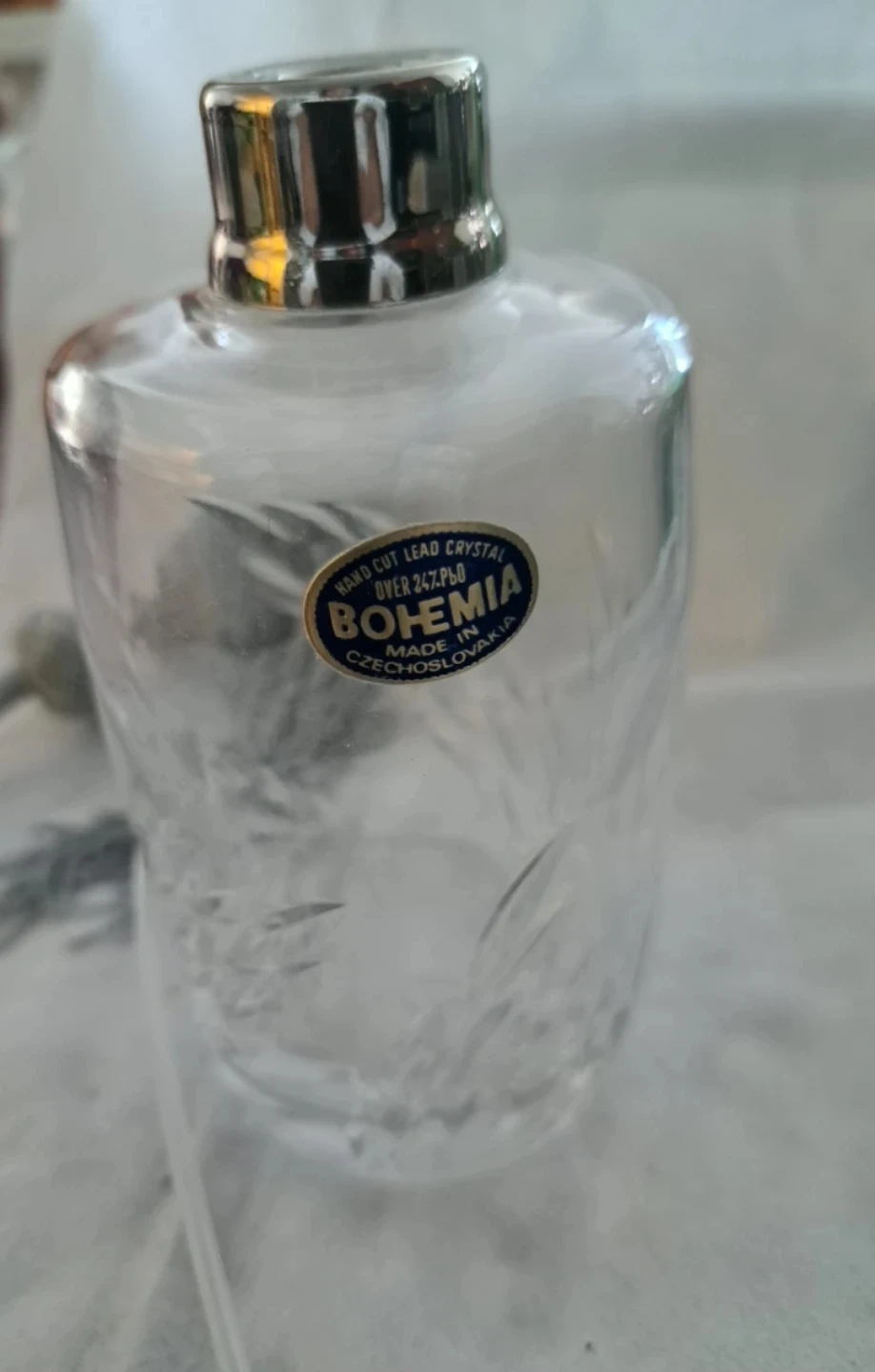 This is a beautiful hand-cut lead crystal perfume atomizer. It's made in Czechoslovakia by Bohemia. The glass has an etched floral design and a silver-tone metal pump with a decorative tassel. It's a lovely vintage piece for your vanity!