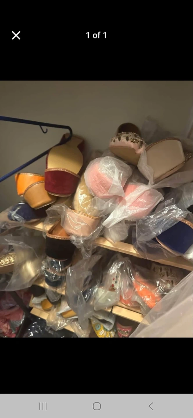 A collection of women's flat shoes and sandals in various colours and styles. Many appear to be new or lightly used, individually wrapped. Assorted sizes and designs included.