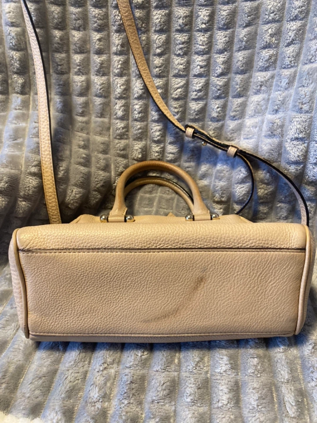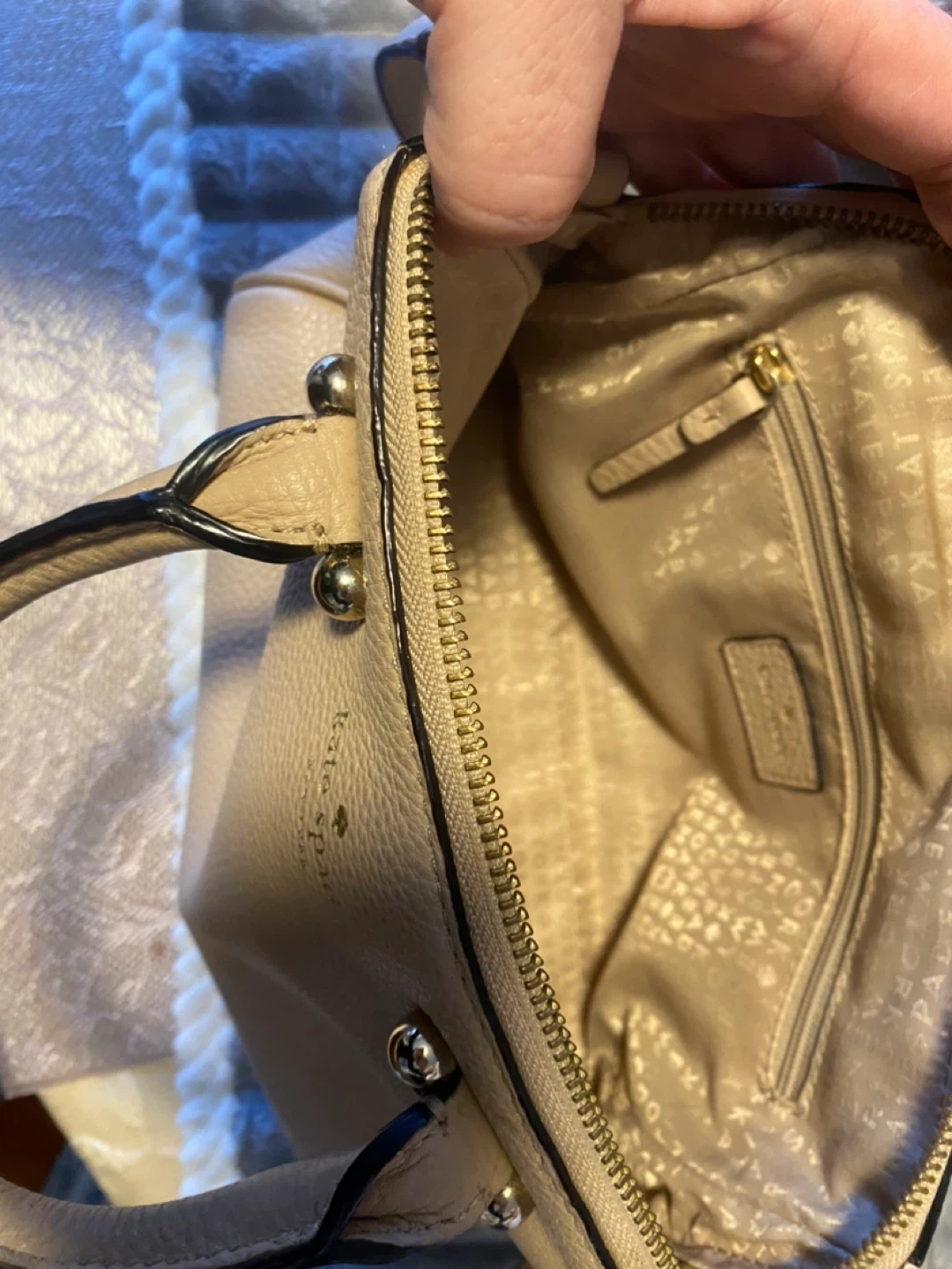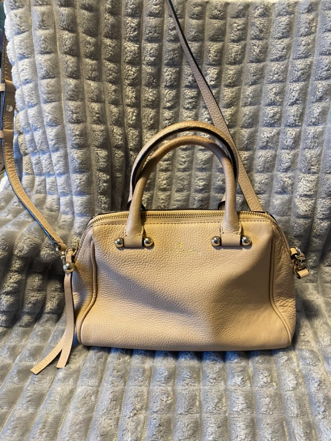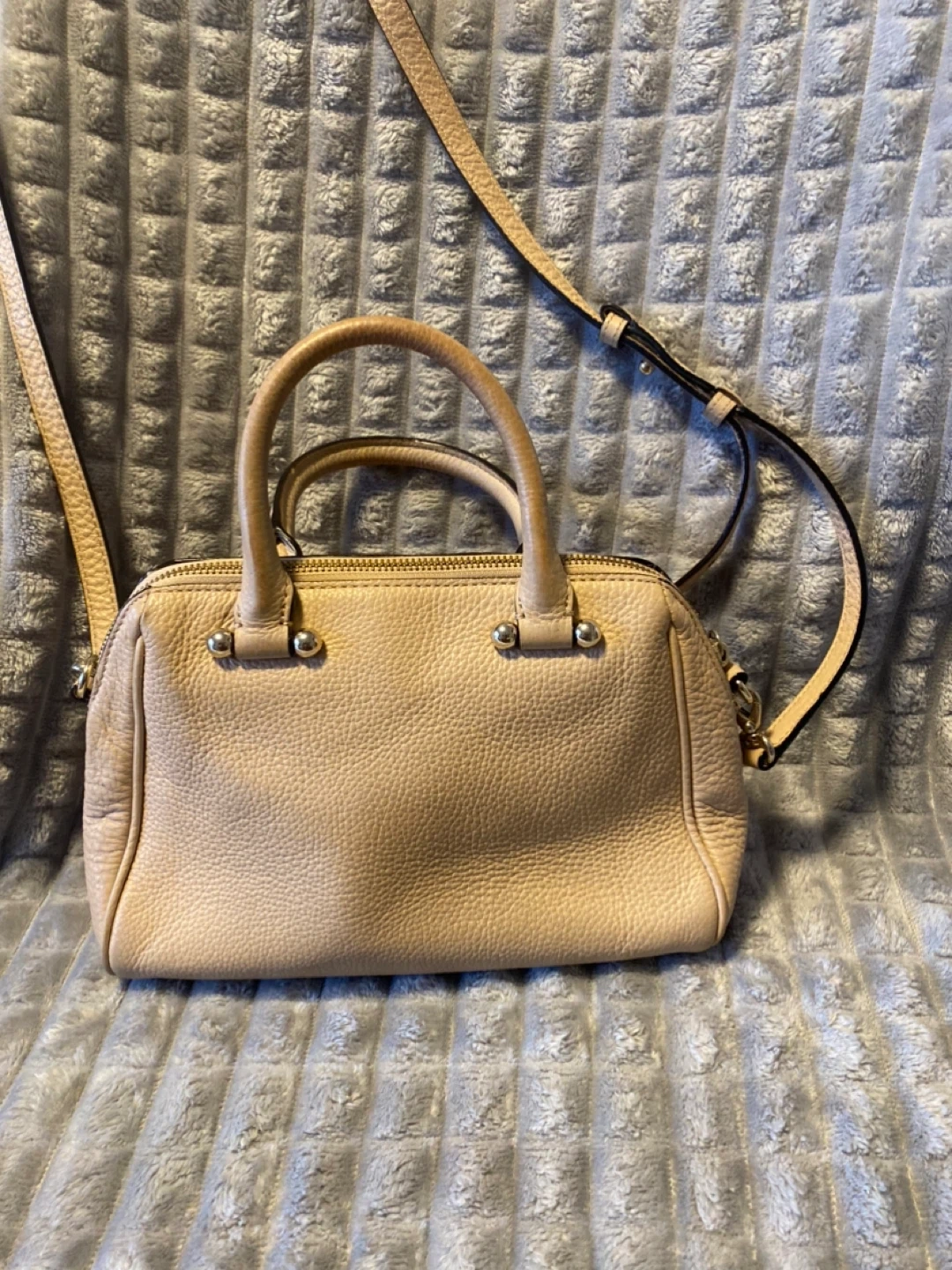 This is a pale beige Kate Spade satchel handbag. It's made of genuine leather and includes a removable shoulder strap. The interior features a zippered pocket and slip pockets for organization.