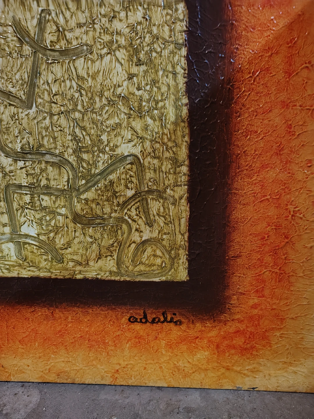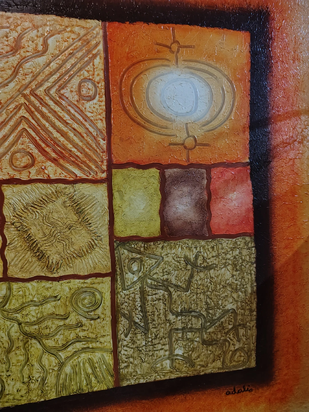 Unique and vibrant piece of abstract art, signed Adalis. I purchased this directly from the artist in the Dominican Republic about 20 years ago. It hung proudly in my living room until I moved about 18 years ago, and it’s been safely stored since.