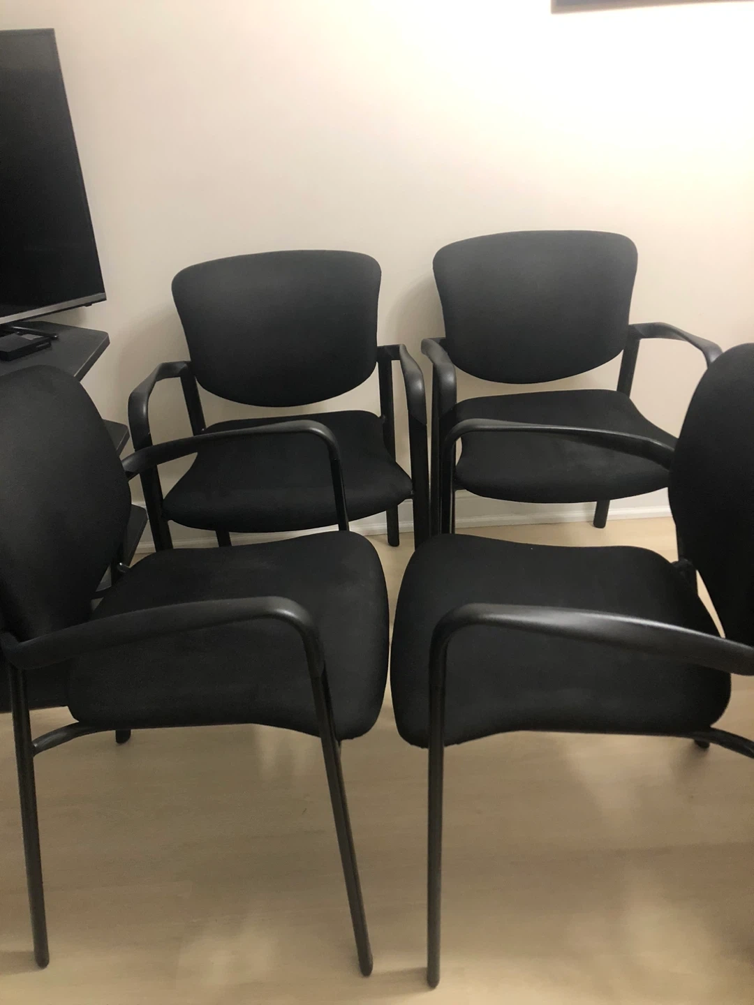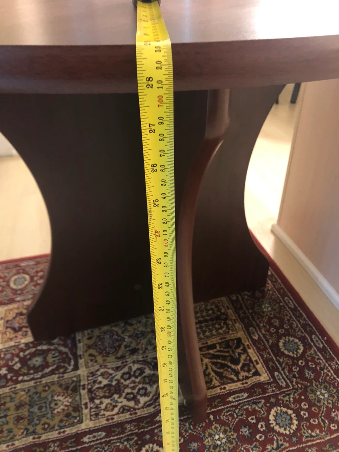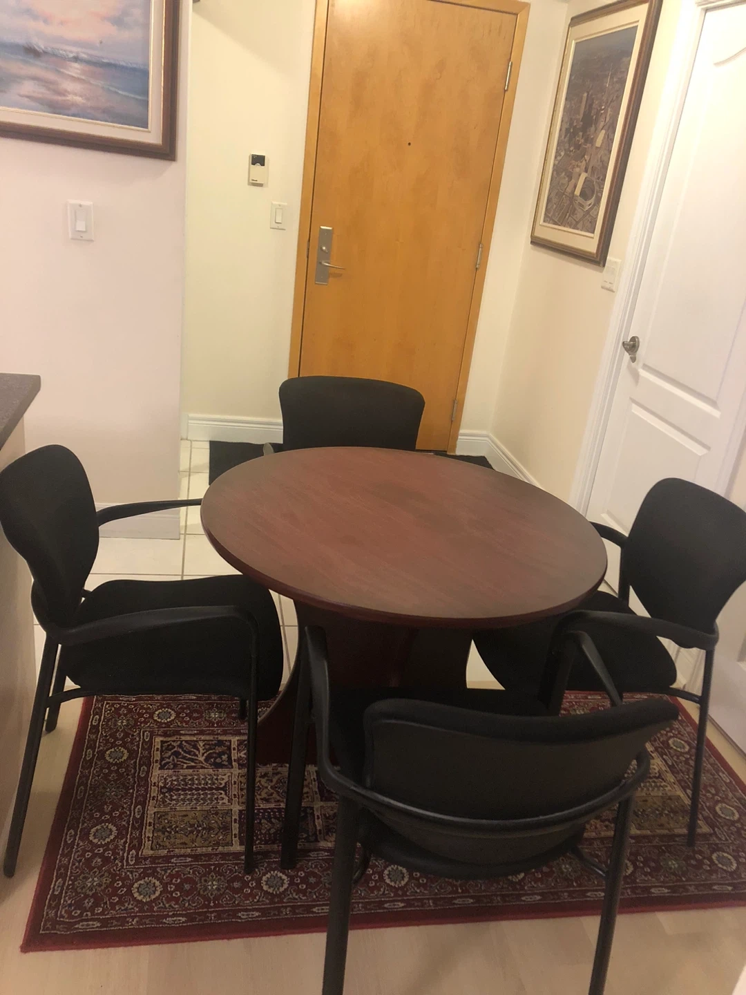 Selling a round wooden table that's perfect for a dining area or office space. It comes with four comfortable black chairs. The table's diameter is approximately 35 inches. This set is great for small gatherings or everyday use!