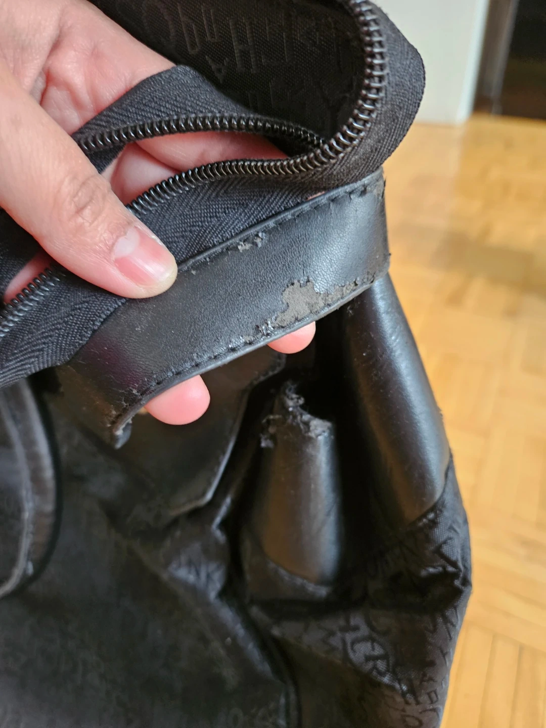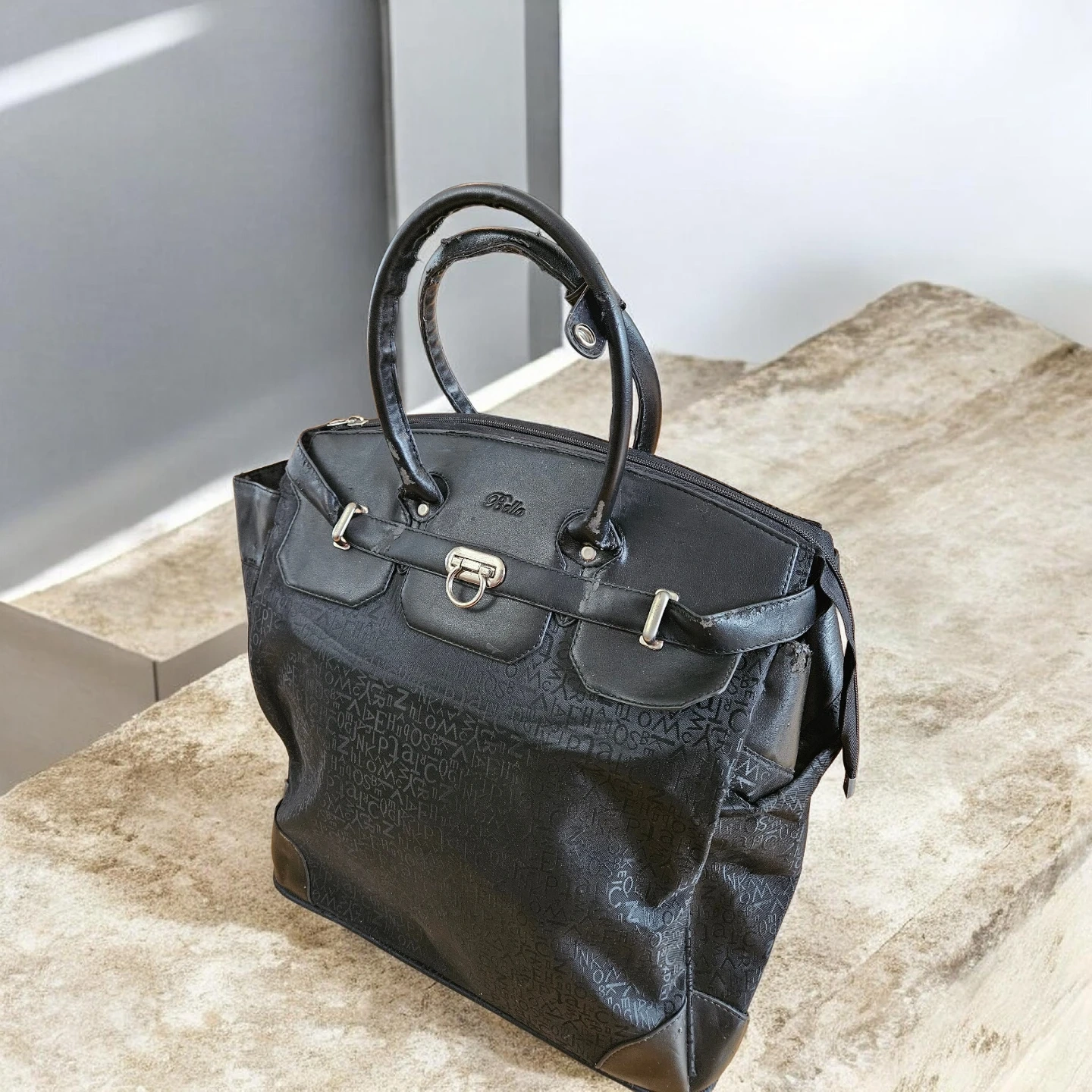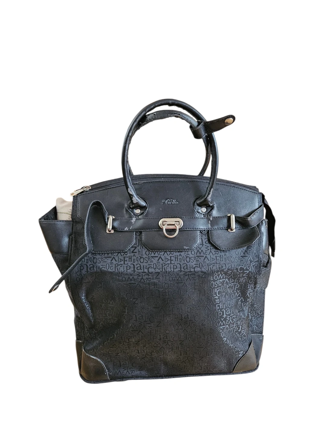 Black Bella Perucci rolling travel bag with a patterned exterior and leather trim. This bag features a telescoping handle and wheels for easy transport. Some wear and tear on the leather trim is visible.