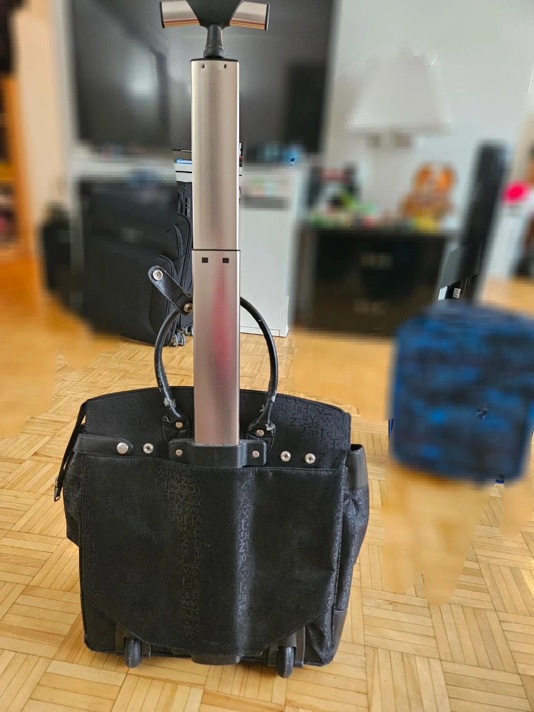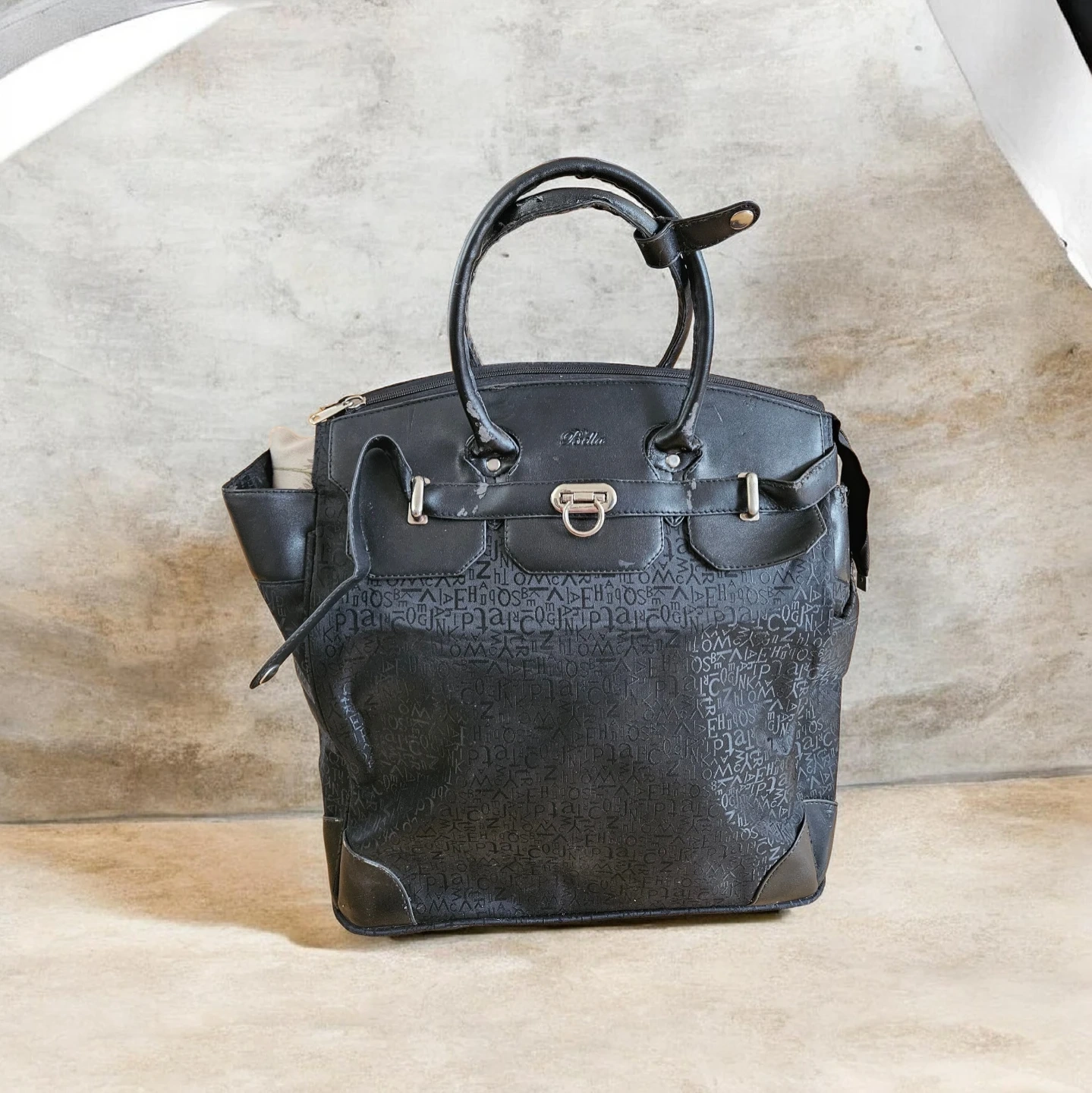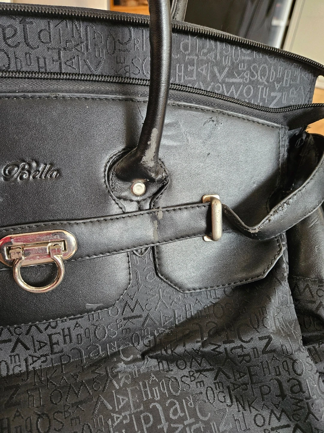 Black Bella Perucci rolling travel bag with a patterned exterior and leather trim. This bag features a telescoping handle and wheels for easy transport. Some wear and tear on the leather trim is visible.