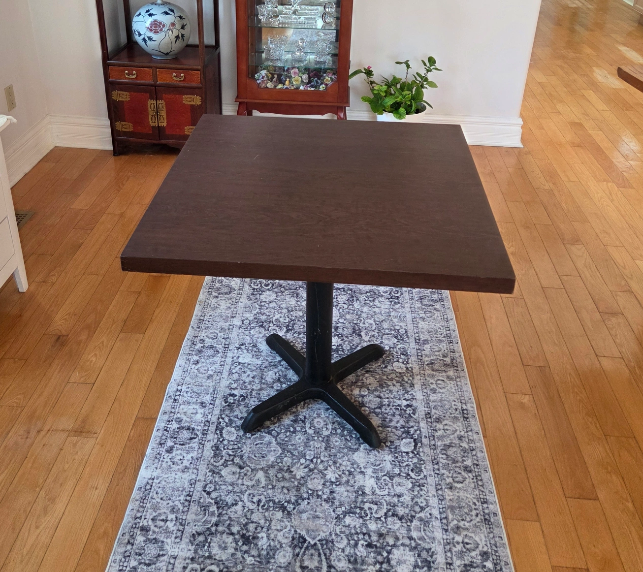 Selling a square table with a dark brown top and a black metal base. It's in good condition and would be great for a small dining area or as an accent piece in a living room
