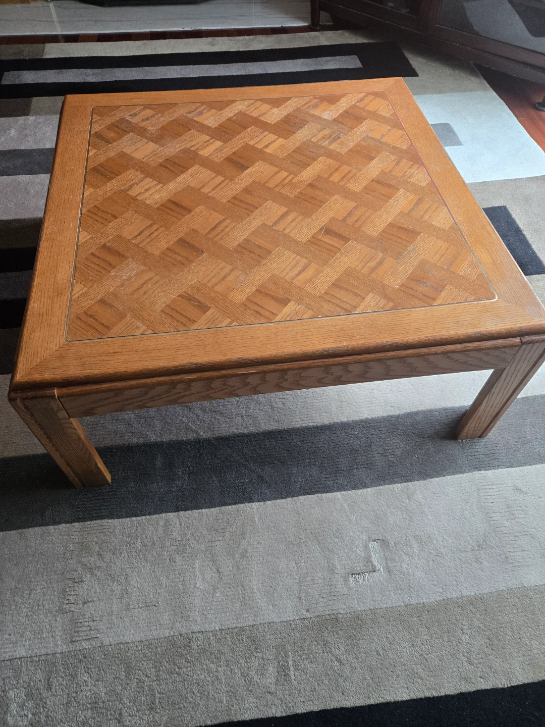 12Unique wood coffee table. 36" sides. Features a parquet-style top. Simple, sturdy legs. Solid wood construction - $45. Located in central Etobicoke, willing to deliver within 5 km.. A matching console/sofa table 16" w 52" long 25" high also available - $40