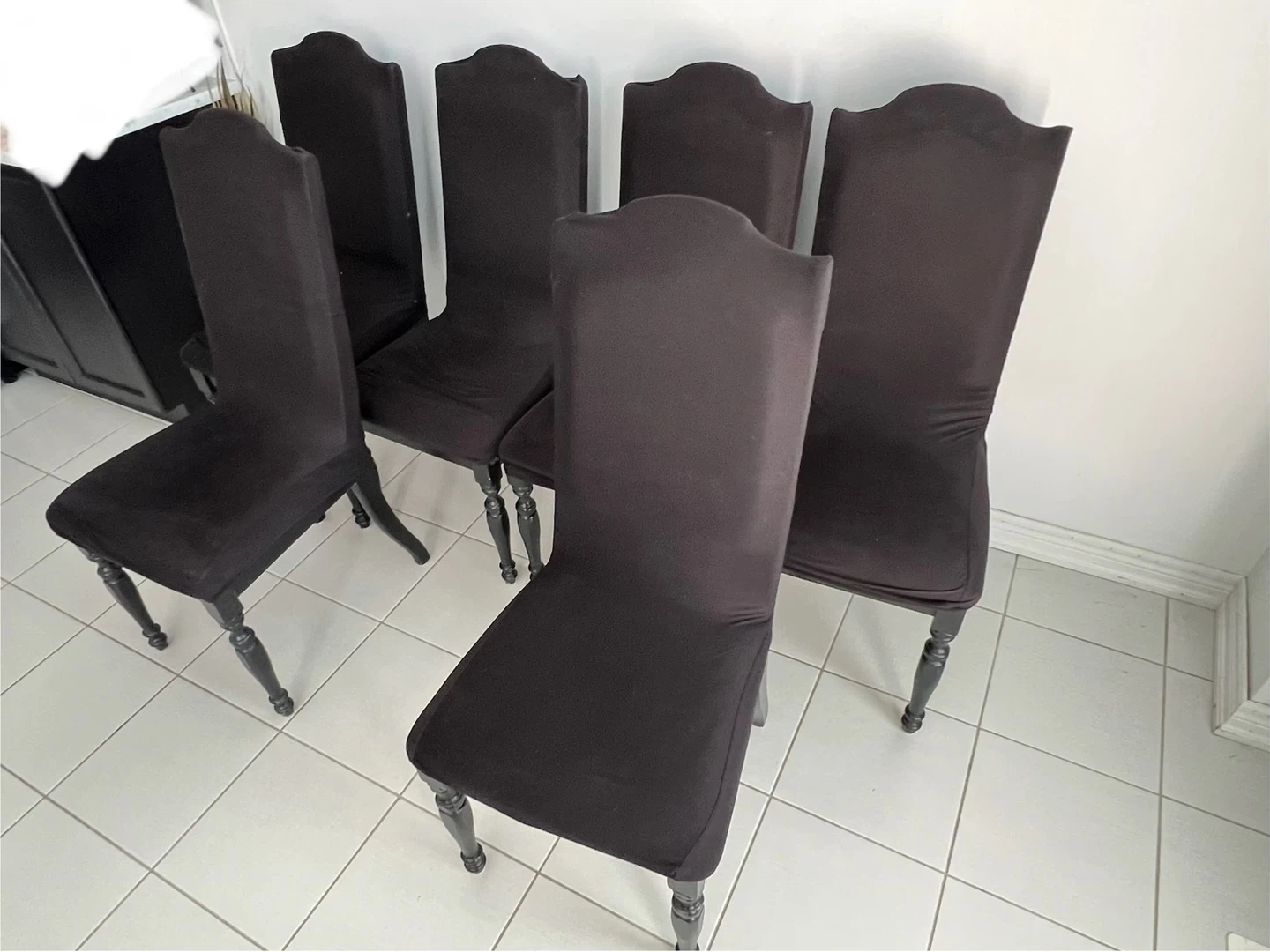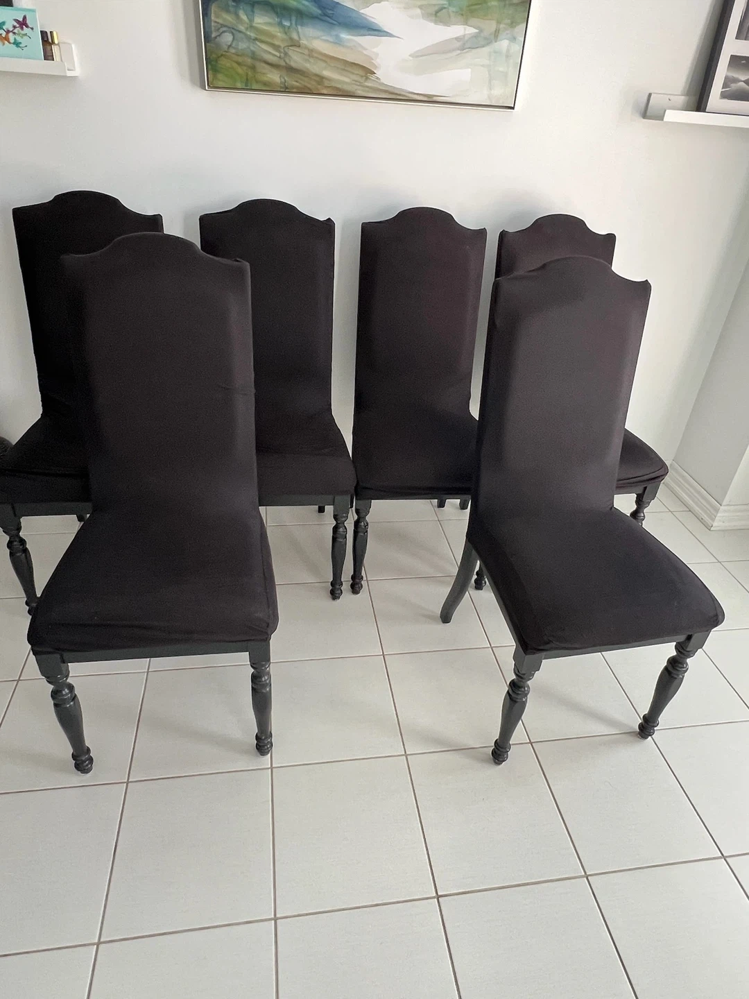 Selling a set of six black dining chairs. These chairs feature a stylish upholstered design and wooden legs. They're ready to add a touch of elegance to your dining space. Great for hosting dinner parties!