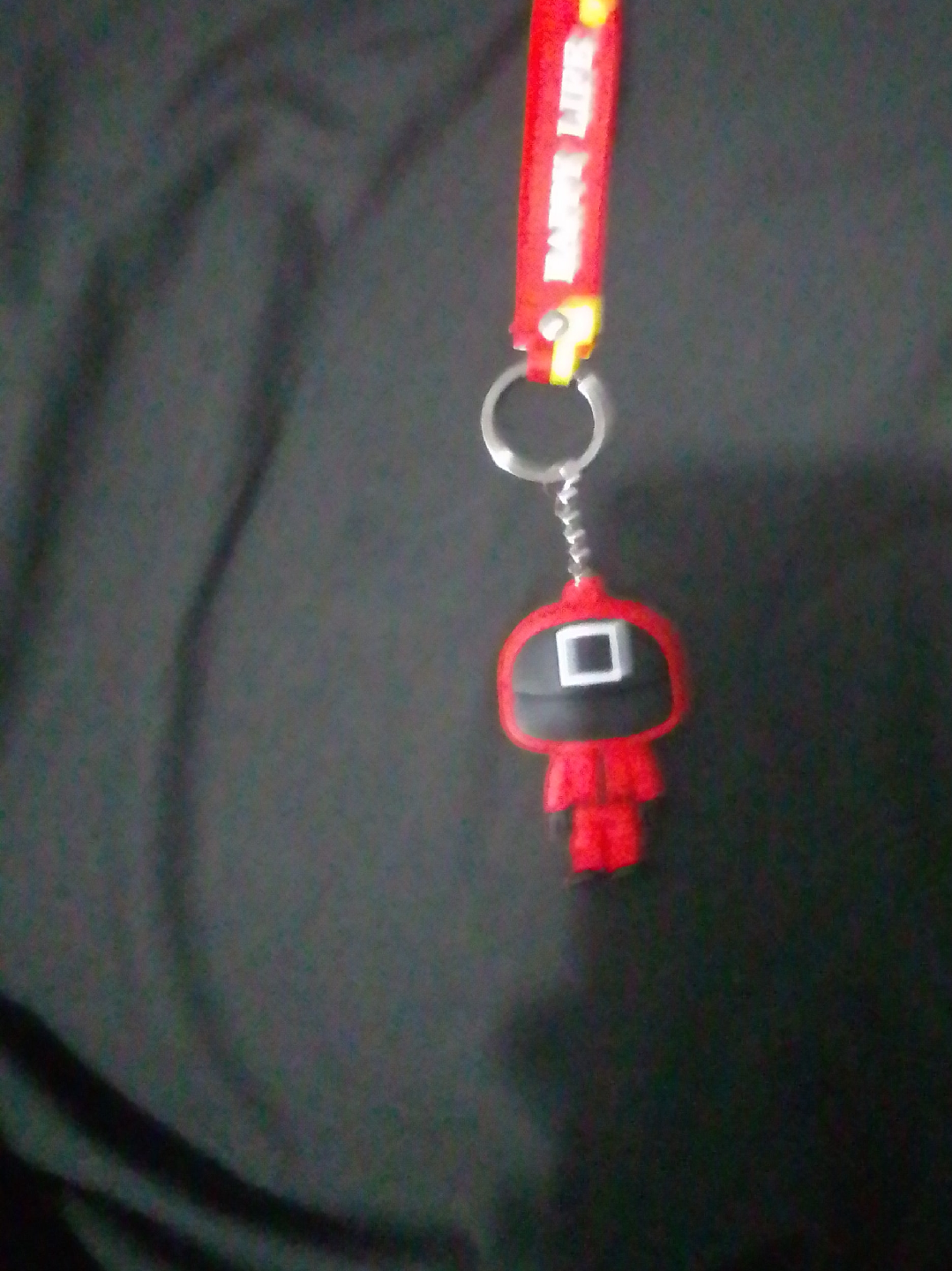 Here's a fun Squid Game keychain! It features one of the characters from the show. It's in great condition and ready to add some flair to your keys or backpack