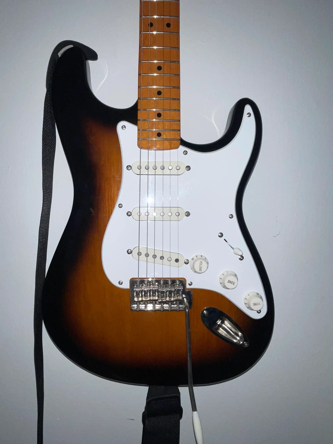Selling a Squier Classic Vibe '50s Stratocaster with a maple fingerboard. It's an electric guitar in a 2-color sunburst finish. This guitar is in great condition and ready to play!