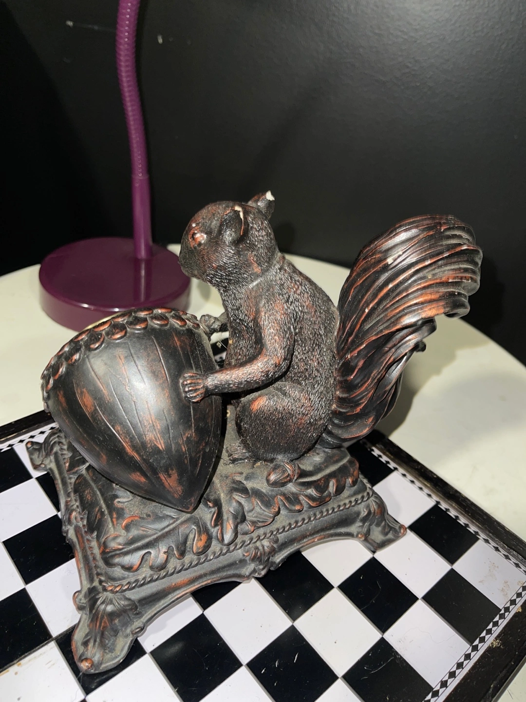 72Unique clock figurine featuring a squirrel design. Dark brown/black colour. Features a small clock face. Intricate detailing on the base. Collectible item.