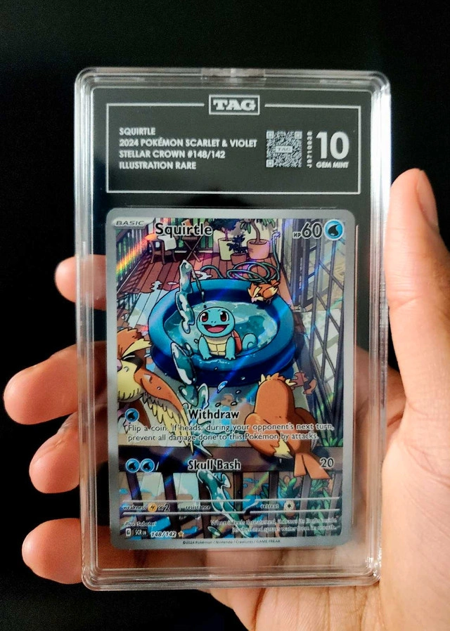 18Beautiful Squirtle from the Stellar Crown set, graded TAG 10 — perfect condition and great for collectors or investors. Last 3 sales were over $530. Asking 520 obo or send offers for any trades. Located In Scarborough!