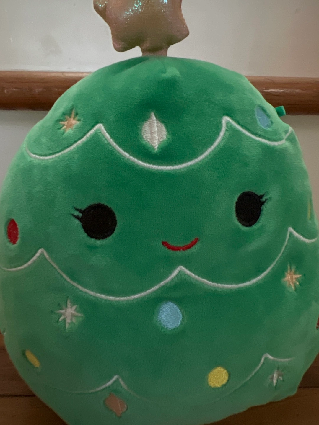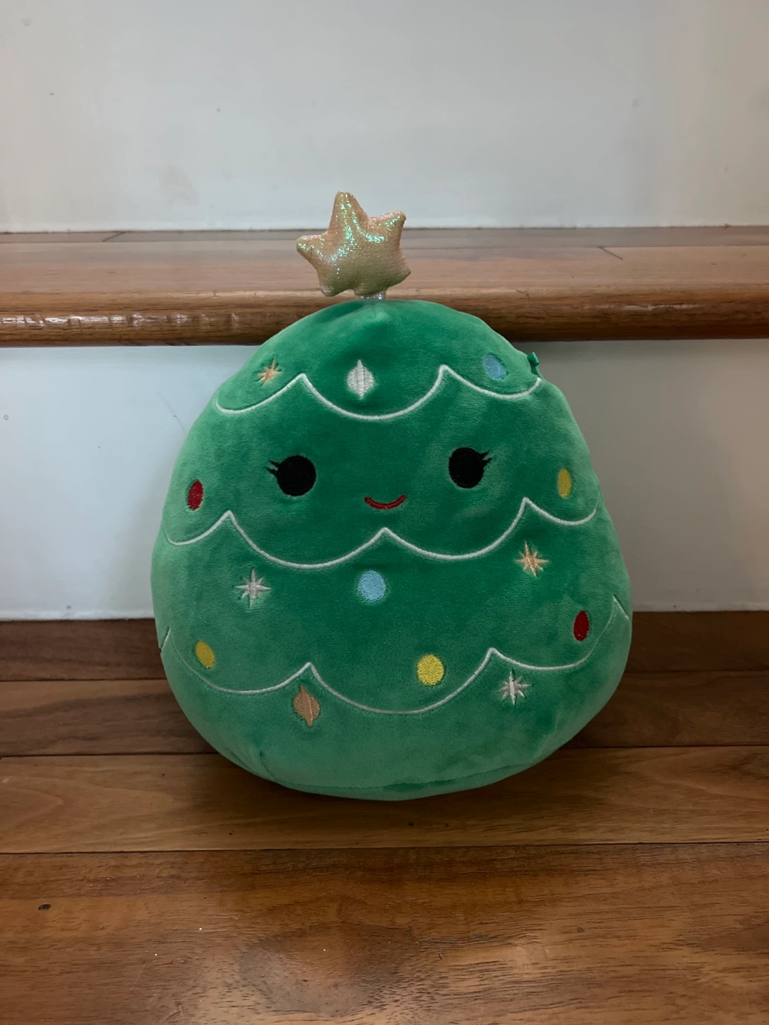 Adorable Christmas tree Squishmallow. Soft plush material. Festive design. Perfect holiday decoration or gift.