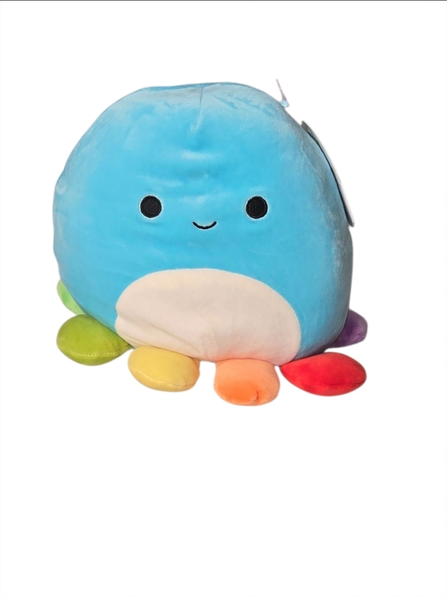 This is a cute and cuddly Squishmallow plush toy! It's in great shape and ready for a new home. It is a blue plush with rainbow coloured tentacles. Perfect for kids and collectors alike