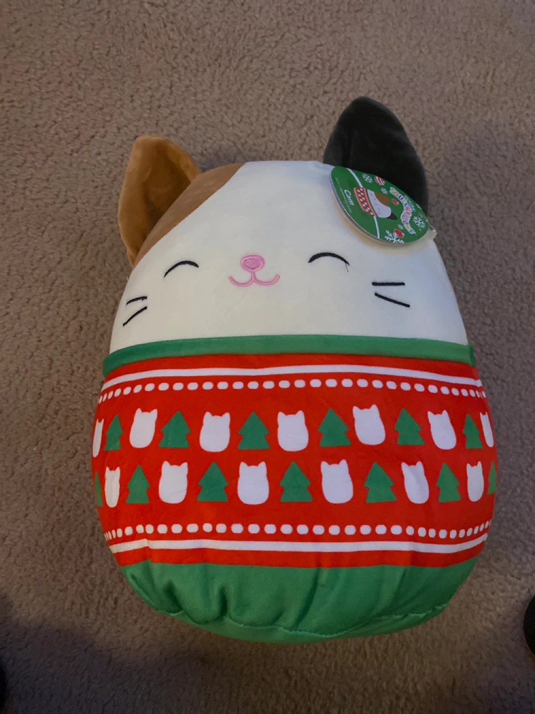 98Here's a super cute Squishmallows Cam the Cat plush toy! It features a festive Christmas sweater design. Perfect for snuggling or adding to your collection