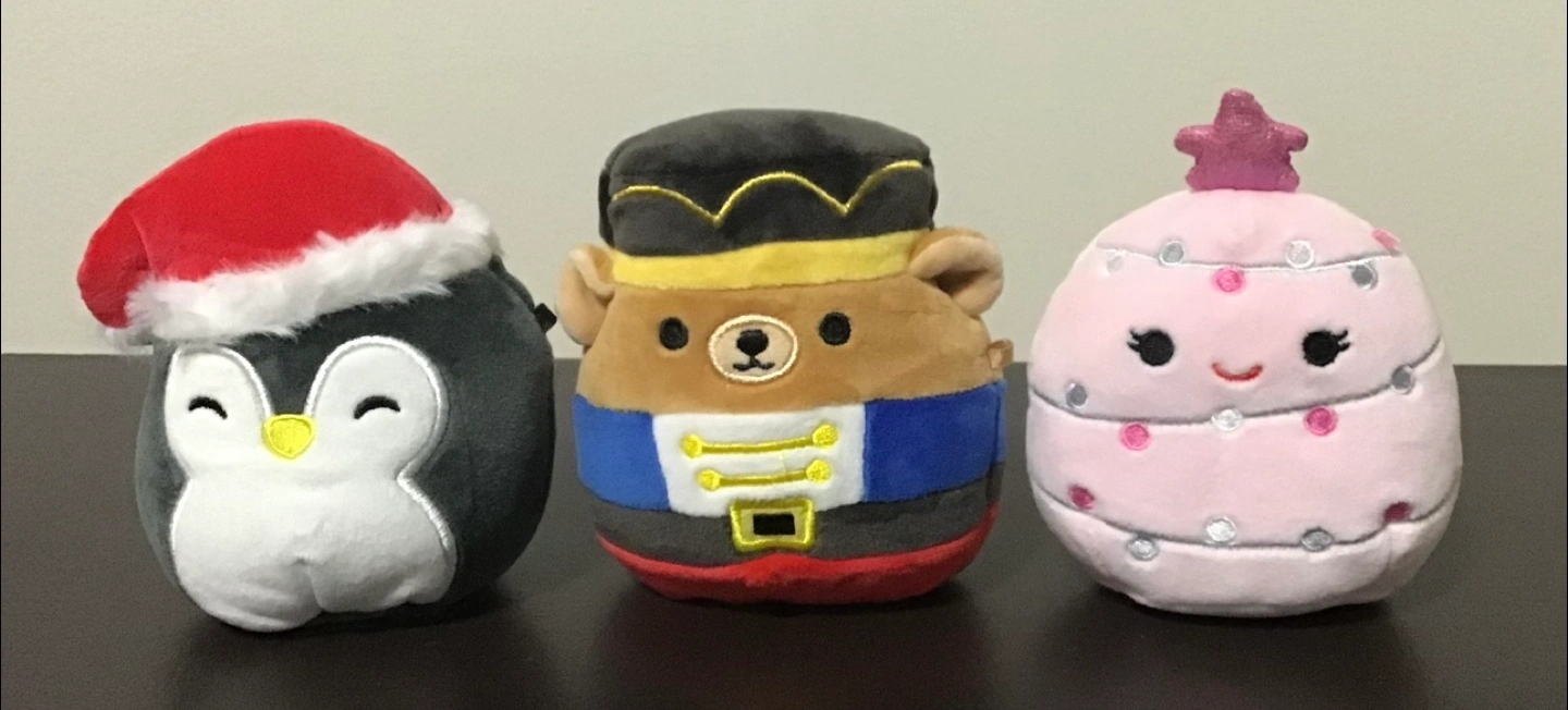 88Selling a set of three adorable Squishmallows holiday plushies! These include a penguin with a Santa hat, a nutcracker bear, and a Christmas tree. They're perfect for adding a touch of festive cheer to any space, as is. Available 11-3 for pick up $15.00 exact cash only Small, each one fits in my hand More info in photo