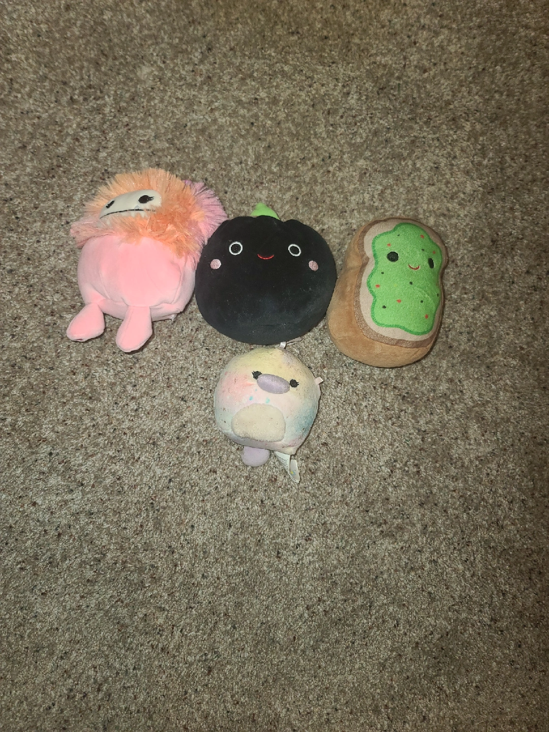 Selling a collection of cute Squishmallows plush toys! They're in great shape and ready for a new home. Perfect for cuddling or collecting. Includes a black pumpkin, a pink furry creature, an avocado toast, and a pastel-colored bird
