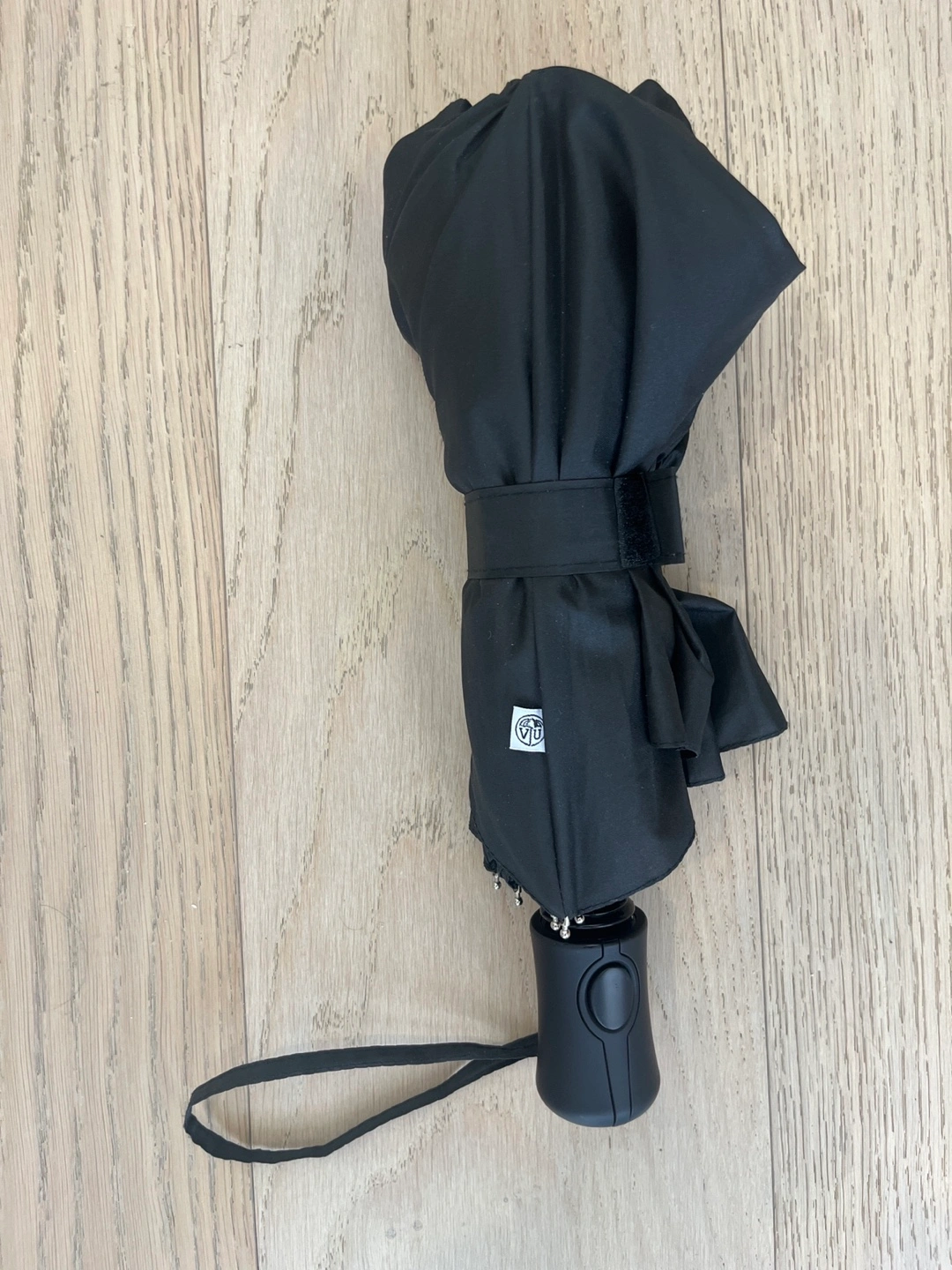 Convenient foldable umbrella. Black fabric, easy to carry. Automatic open/close button. Wrist strap included.