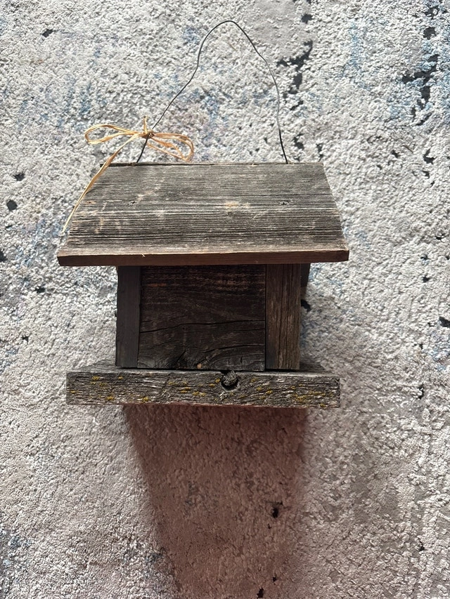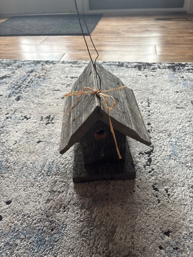 This rustic wooden bird house provides a cozy sanctuary for your feathered friends, featuring a charming design and natural appeal. It is in good condition. This little abode is just waiting to welcome some chirpy tenants! If the ad is still up, the bird house is still ready for a new home. Cash accepted.