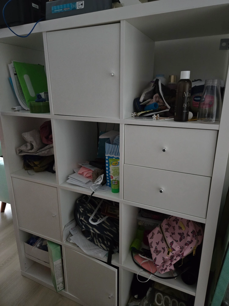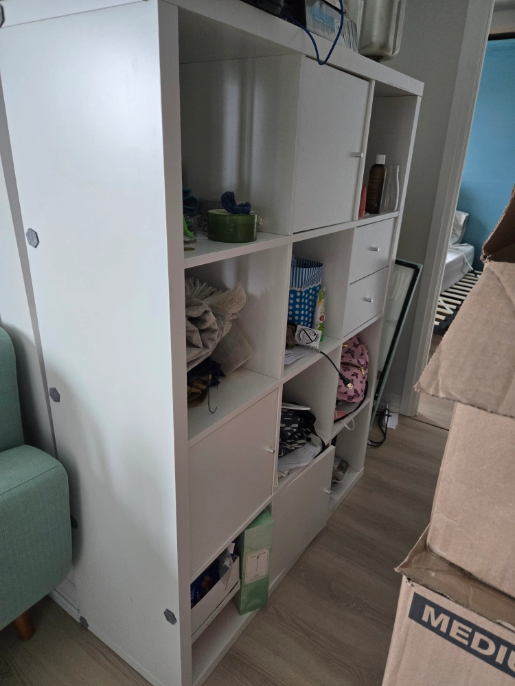 White IKEA Kallax shelving unit. Four shelves high, 3shelves wide. Great for storage. Many compartments. Includes drawers.