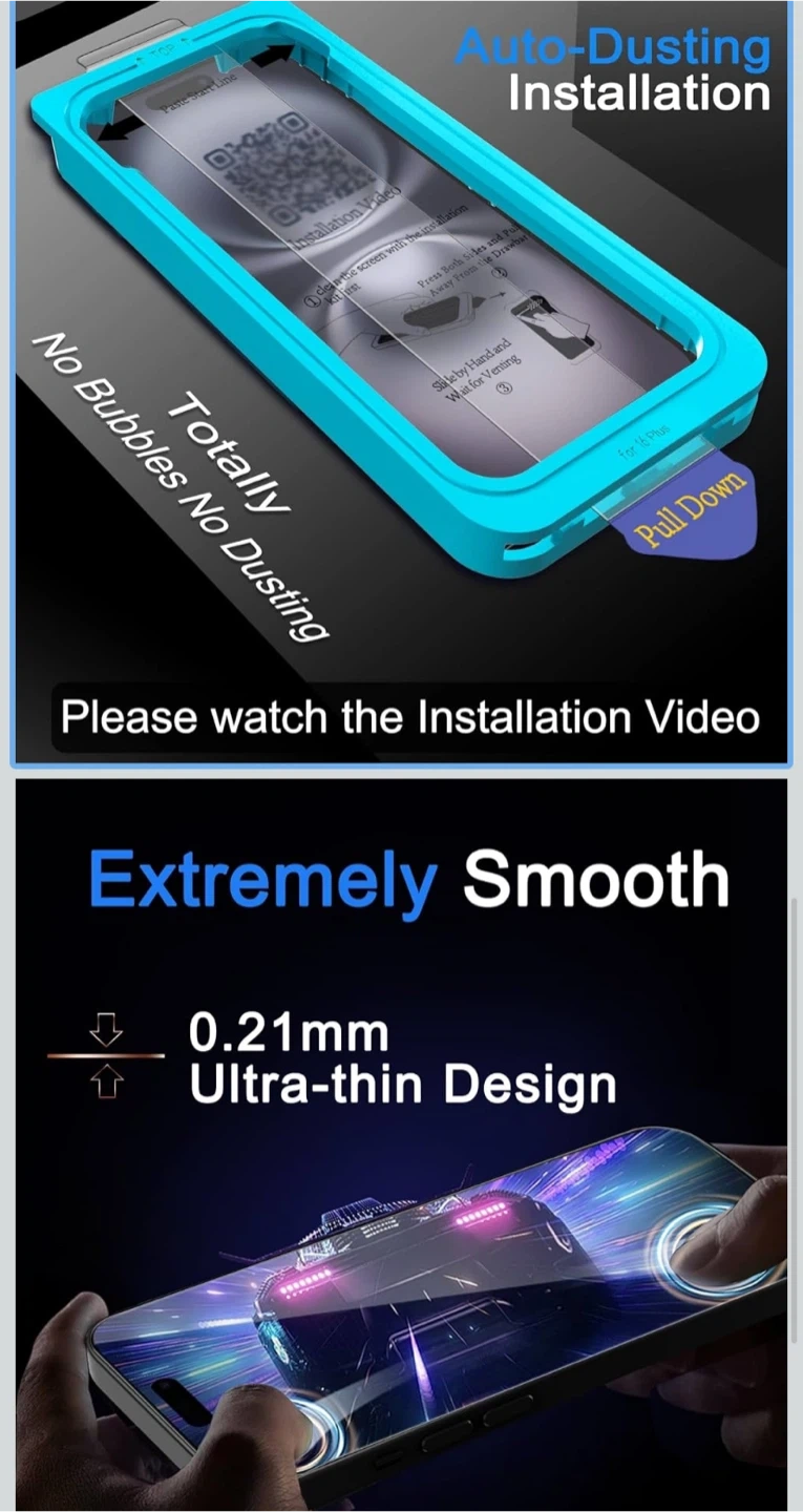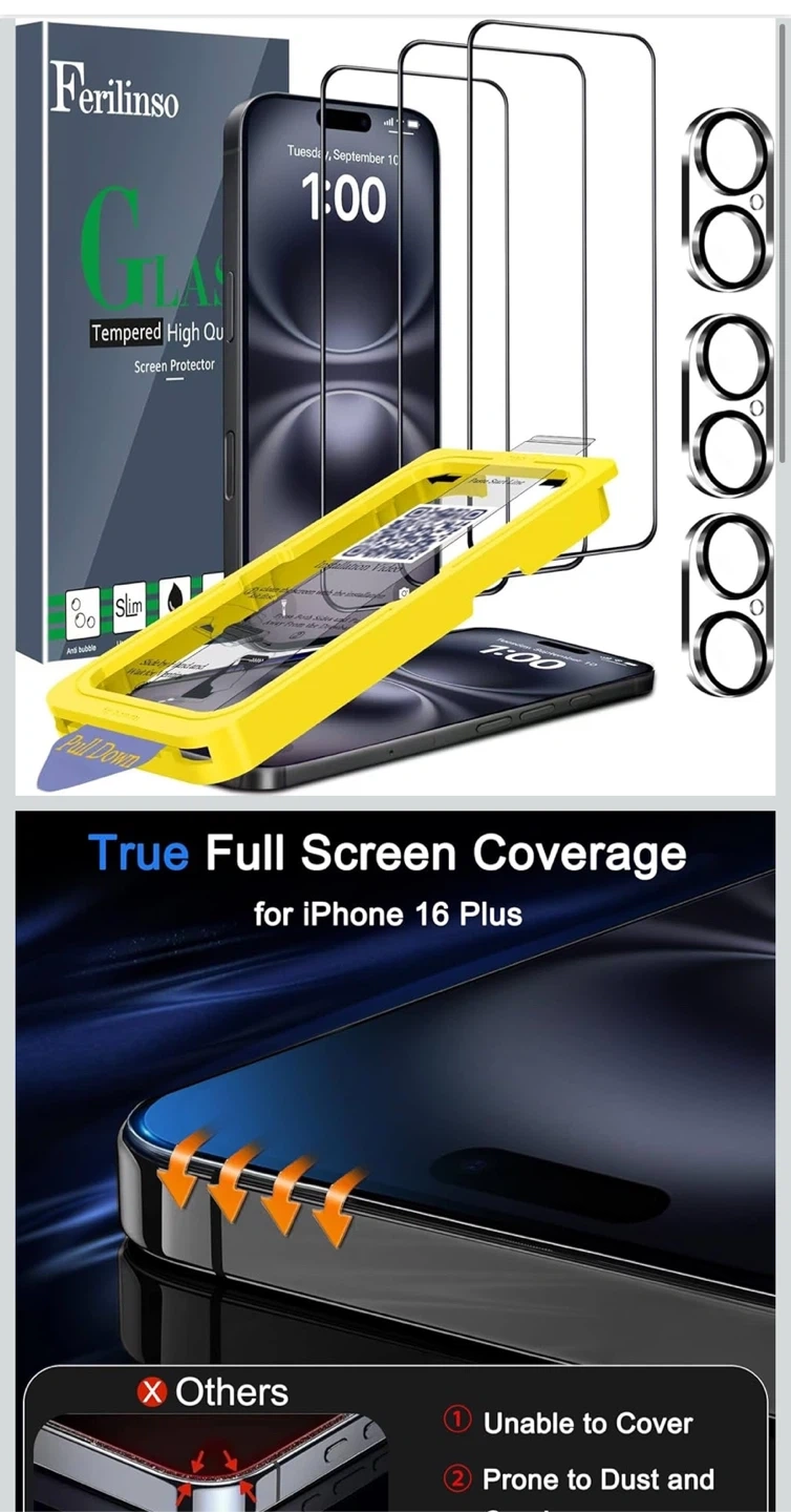 This 6-pack of Ferilinsgo screen protectors offers high quality and ultra-thin design for your iPhone 16 Plus. It features a slim profile with oleophobic coating and 9H hardness for scratch resistance. The kit includes an auto-dusting installation tool for bubble-free application.
