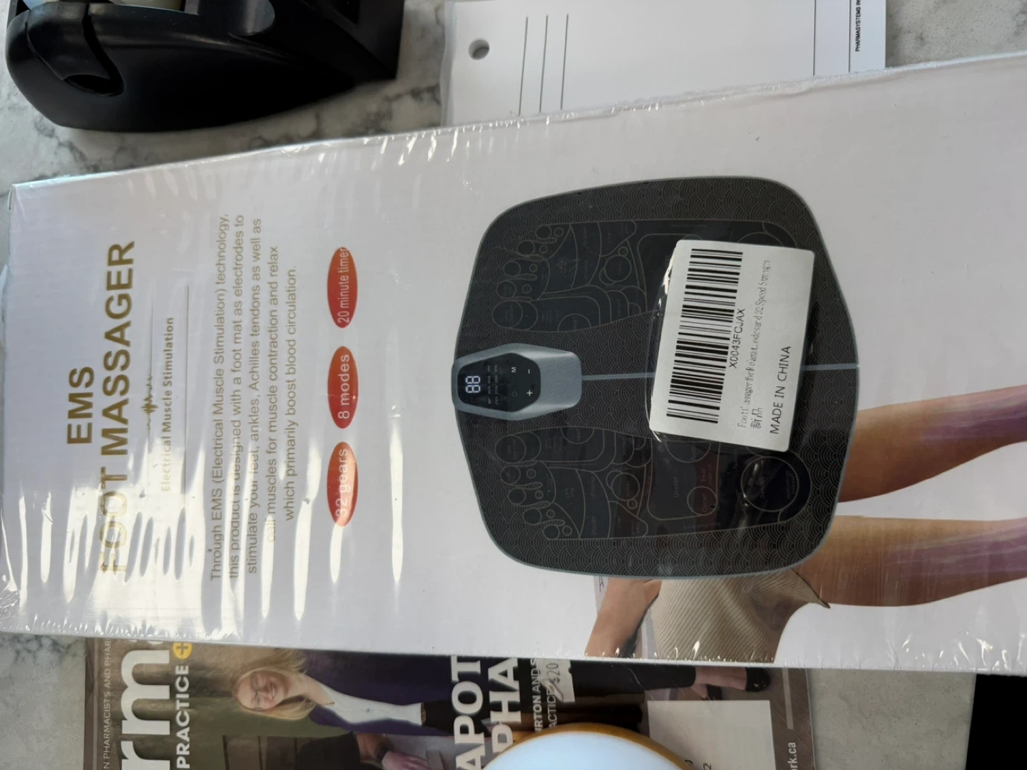 This EMS foot massager uses electrical muscle stimulation technology. It's designed with a foot mat that has electrodes to stimulate your feet and ankles. It offers 8 modes and 32 gears to help with muscle contraction and relaxation, which primarily boosts blood circulation. The device has a 20-minute timer.