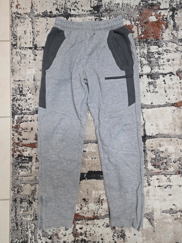 These Jordan sweatpants are made of a soft grey and dark grey material. They feature zippered pockets and ankle zips. Perfect for casual wear or athletic activities. Both are size 12 & in good condition.