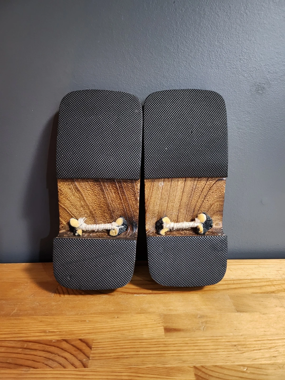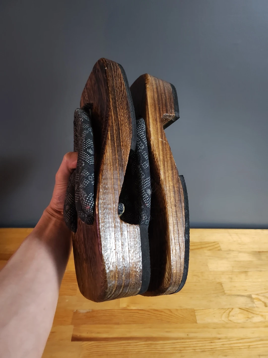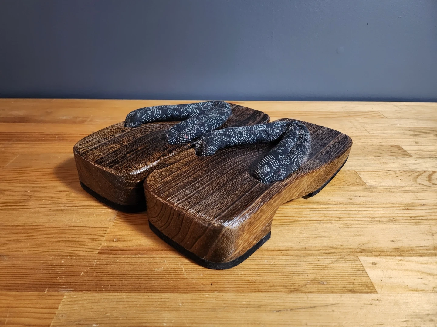 - Material: They are typically made from lightweight woods like paulownia (kiri) and often have a rubber sole for modern comfort and slip resistance. The hanao (thong) is made of a black fabric with a small white pattern.